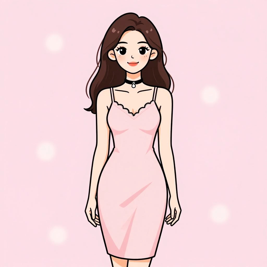 This is a digital drawing of a young woman with fair skin and straight, dark brown hair that reaches her shoulders. She has large, black eyes and a small, pink smile. She is wearing a sleeveless, pink dress with a V-neckline and a floral pattern, cinched at the waist with a thin, matching pink belt. The dress flares out slightly at the bottom, creating a short, A-line skirt. She wears a delicate, silver necklace with a small pendant. The background is plain white, making her the focal point of the image. The style is reminiscent of anime or manga, with clean lines and vibrant colors.
