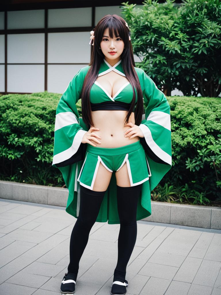 Photorealistic full-length image of a female cosplayer dressed as Hanazono Tae character from the anime series. The woman has long black hair with brown sidelocks adorned with red and white flower hair accessories. She wears a green, white, black, and red costume with a cropped top, pleated skirt, white socks, and black footwear standing outdoors against a hedge and tiled ground. The subject has green eyes and medium build.