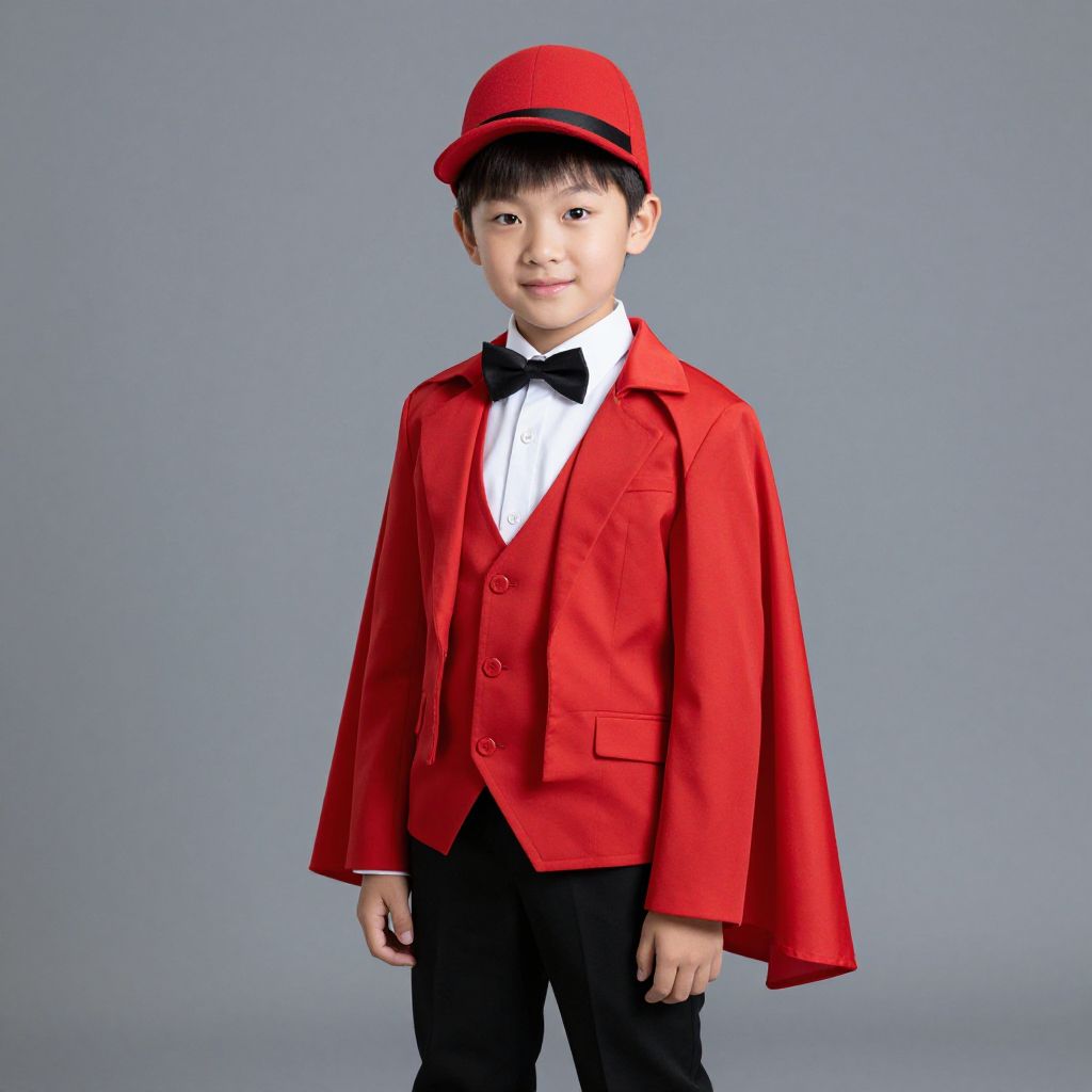 "Youth Ringmaster Costume, boy in a red hat and red jacket with a red cape"