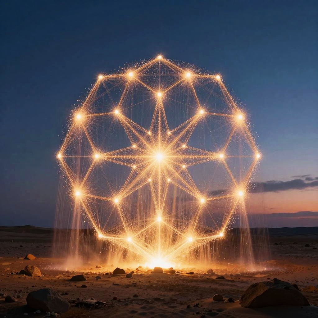 Stable diffusion reimagine visualized as a surreal landscape of cascading light particles forming intricate geometric patterns against a twilight sky, hyper-realistic, fantasy art