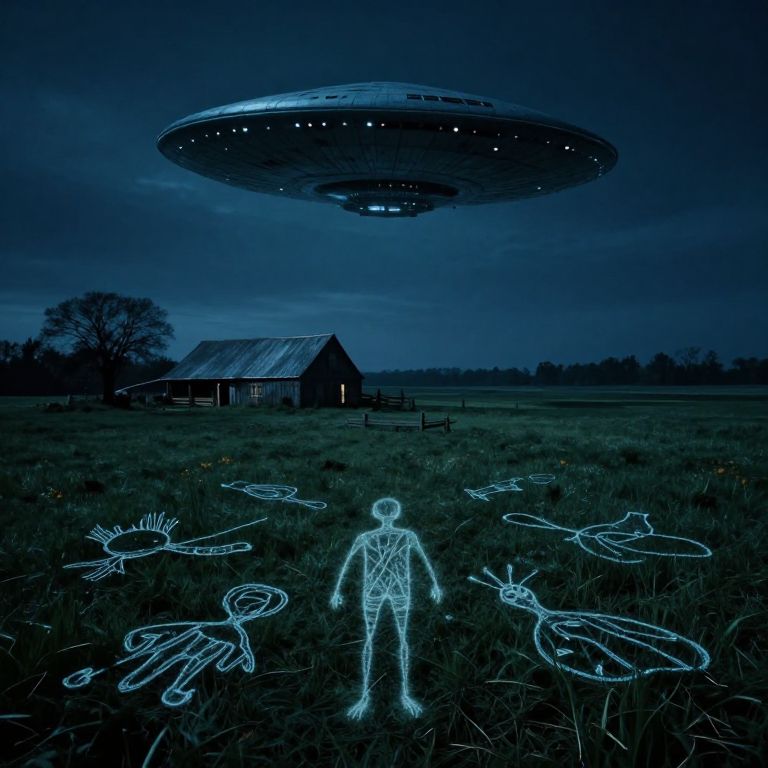 Tenderness a mysterious farm in the middle of the field, mysterious drawings in the field, night, alien ship over the farm,