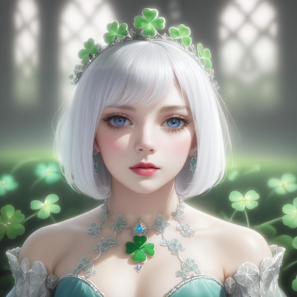 A detailed fantasy portrait of a young woman with short white hair and striking blue eyes, wearing a silver tiara and jewelry adorned with green clover leaves. The soft lighting highlights her flawless complexion and delicate features, set against a softly blurred background resembling a medieval castle interior.