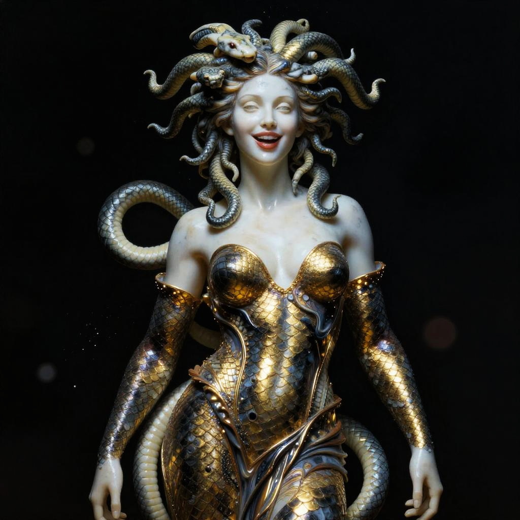 Santa MuWerte, best quality, digital painting, extremely smooth, fluid, 3d fractals, light particles, dreamy, smooth, shimmering, dreamy glow, conceptual art by alberto seveso, anna dittmann, arthur rackham, harmonious color scheme, 32k, cinematic photo a marble statue of Medusa, mid shot, perspective from below, woman portrait fused with structure, short messy hair with coiling marble snakes, black and gold scaly outfit inspired by karol bak, intricate details, long sleeves dress, provocative, seductive, parted lips, evil smile, trending on artstation, black background, simple background, style of Karol Bak, 35mm photograph, film, bokeh, professional, 4k, highly detailed