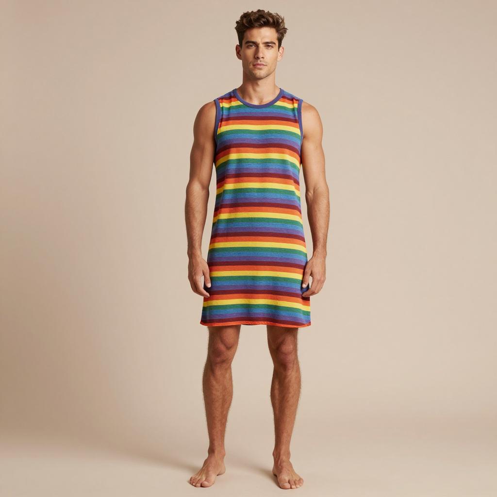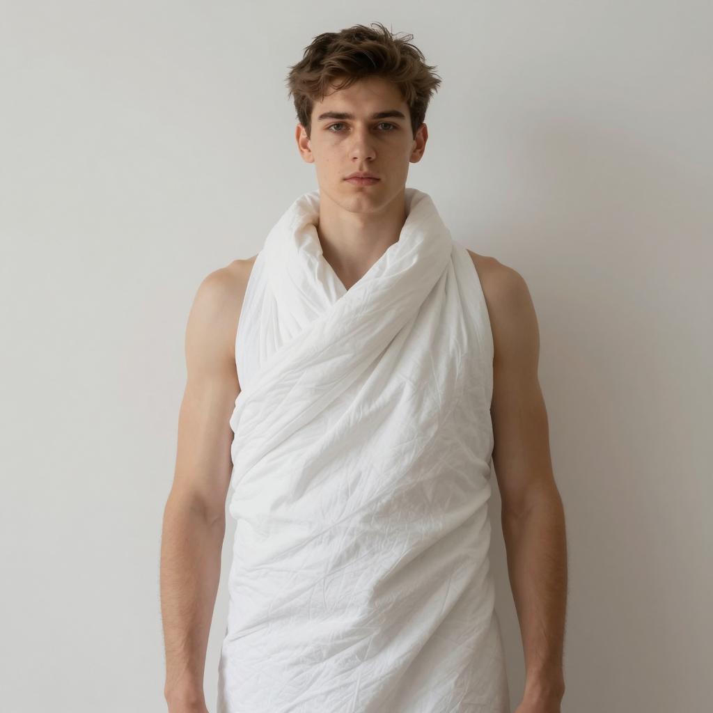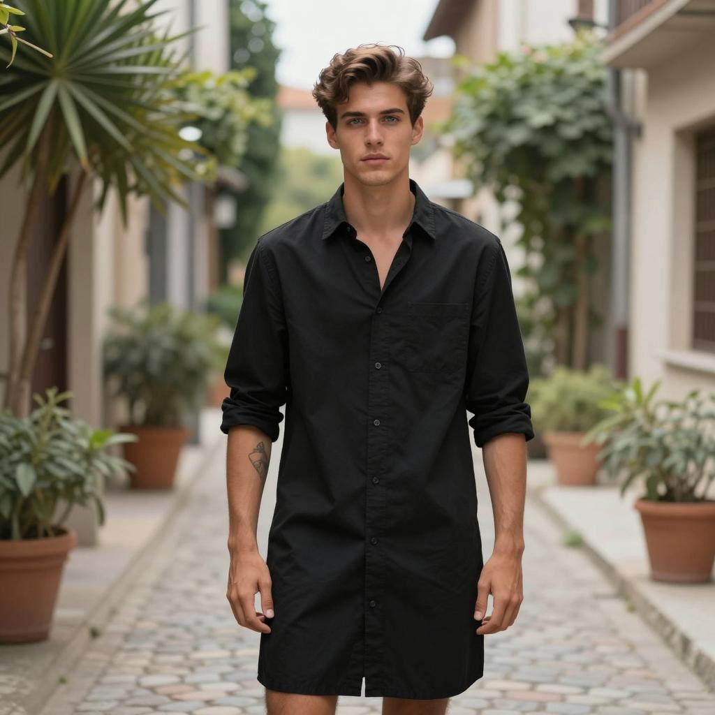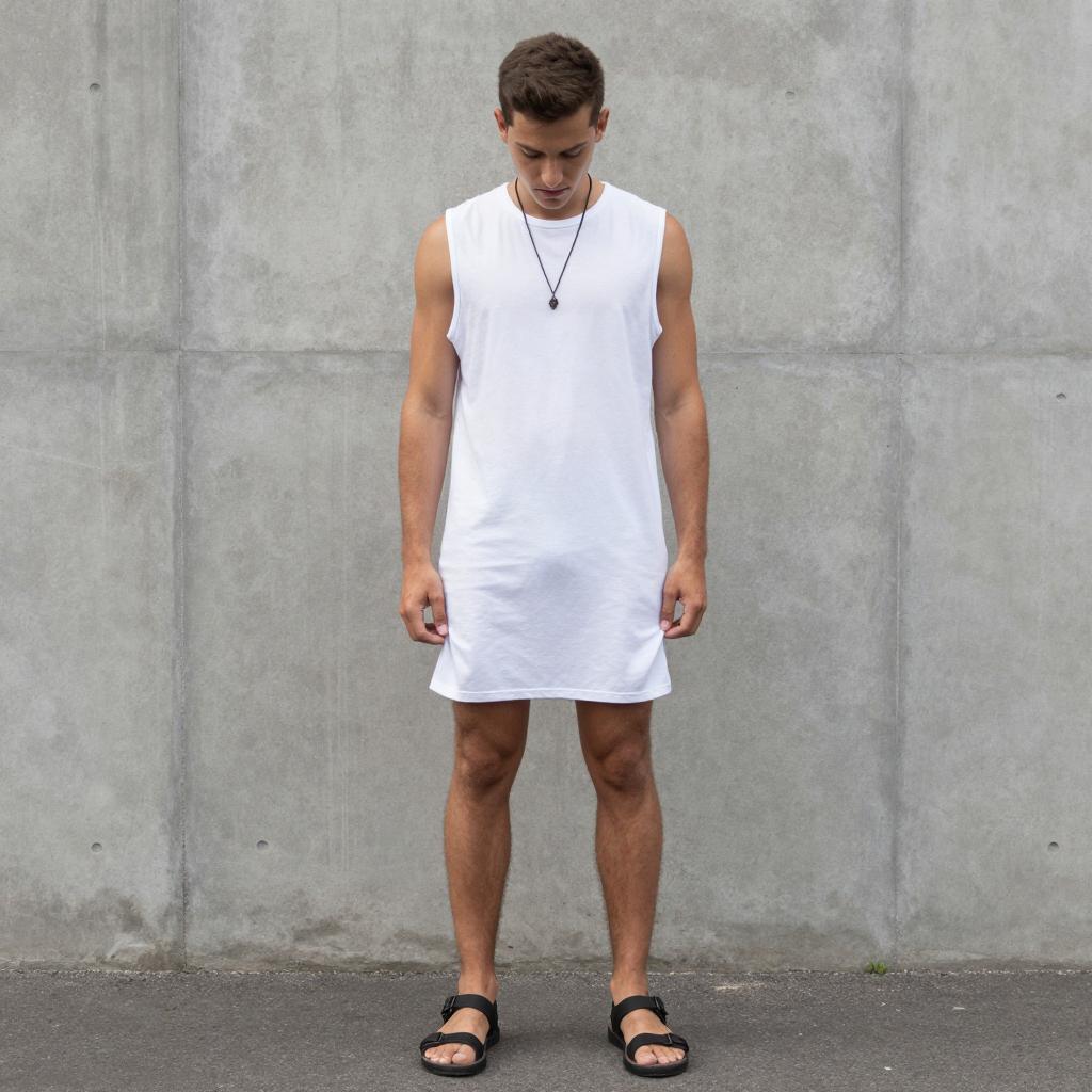 Man rave attire, photograph of young man standing, front view, wearing white sleeveless dress, reaching down to hold hem, black sandals, necklace with pendant, short brown hair, light brown skin, serious expression, gray concrete wall background, daylight, casual style, realistic ure, summer outfit, standing on gray pavement