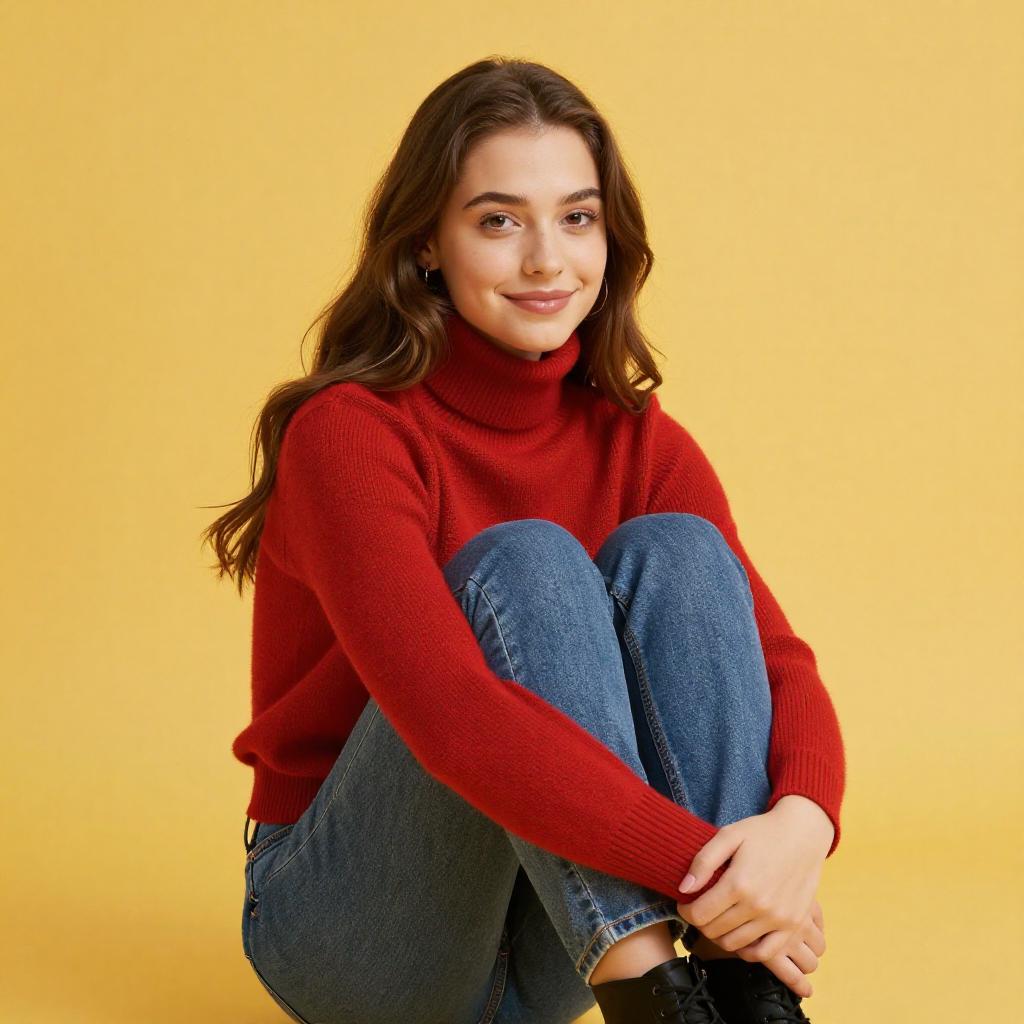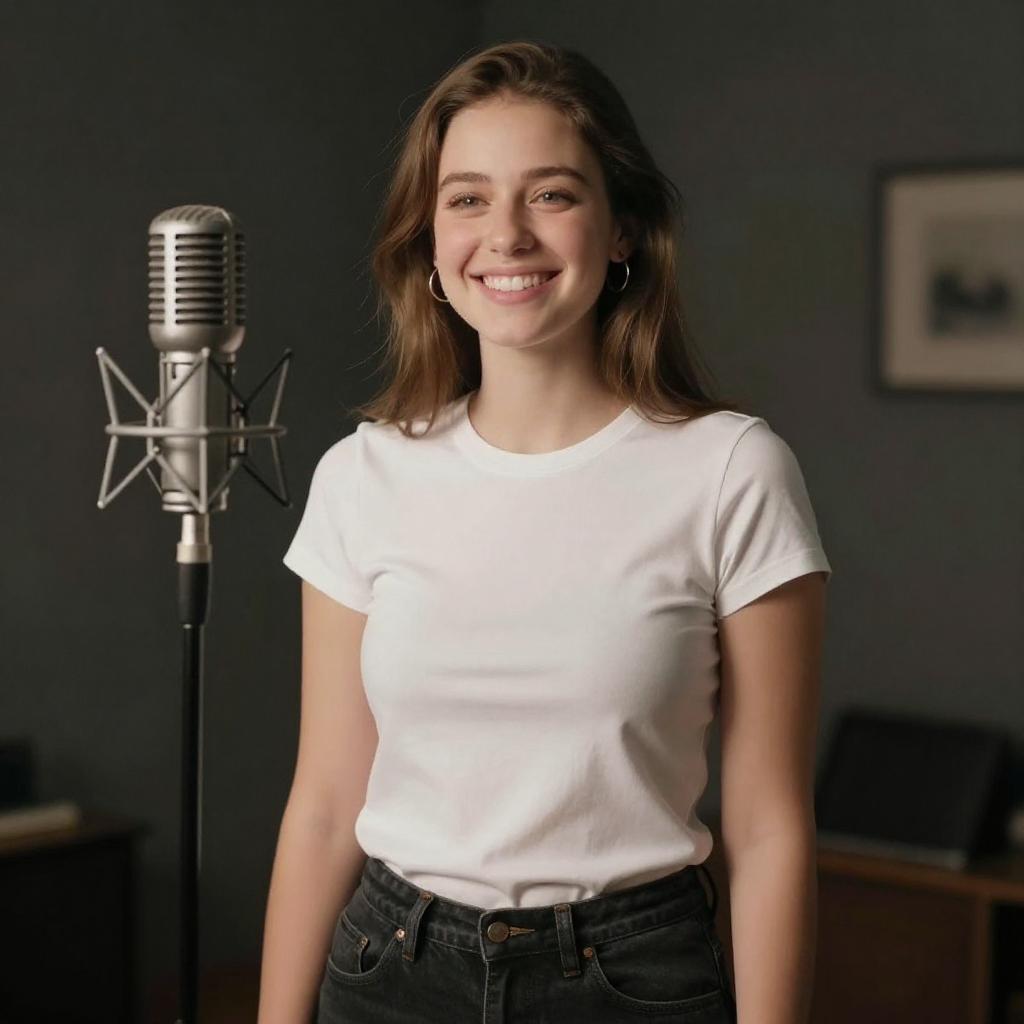 Photograph of a smiling young woman with light brown, shoulder-length hair, wearing a white, short-sleeved, fitted t-shirt and dark jeans. She stands in front of a vintage, large-diaphragm microphone on a stand, with a dimly lit background. Her light skin contrasts with the dark surroundings, and she wears small hoop earrings.
