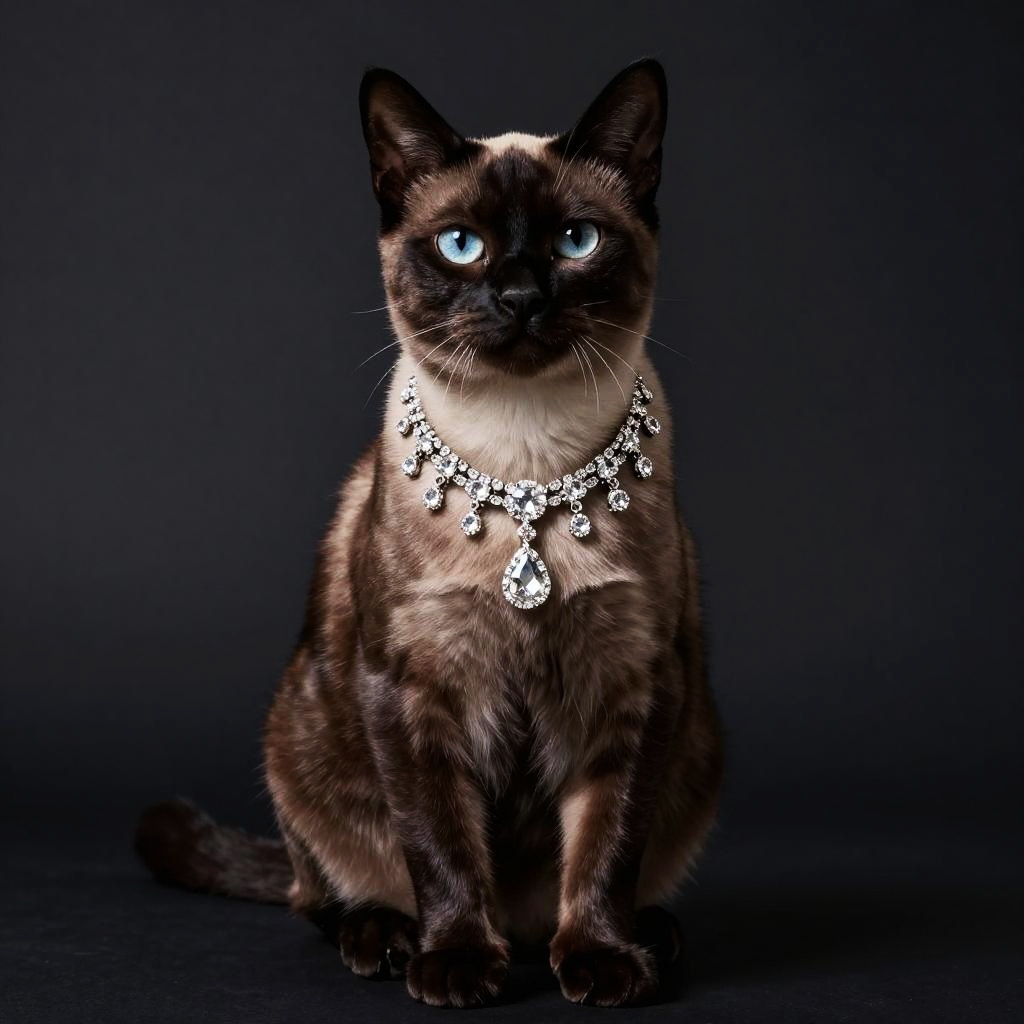 Luxurious studio portrait of a Chartreux cat sitting upright, glossy dark fur, wearing an ornate sparkling diamond necklace, clean dark background with spotlight, high-end fashion pet photography, high resolution, ultra-detailed