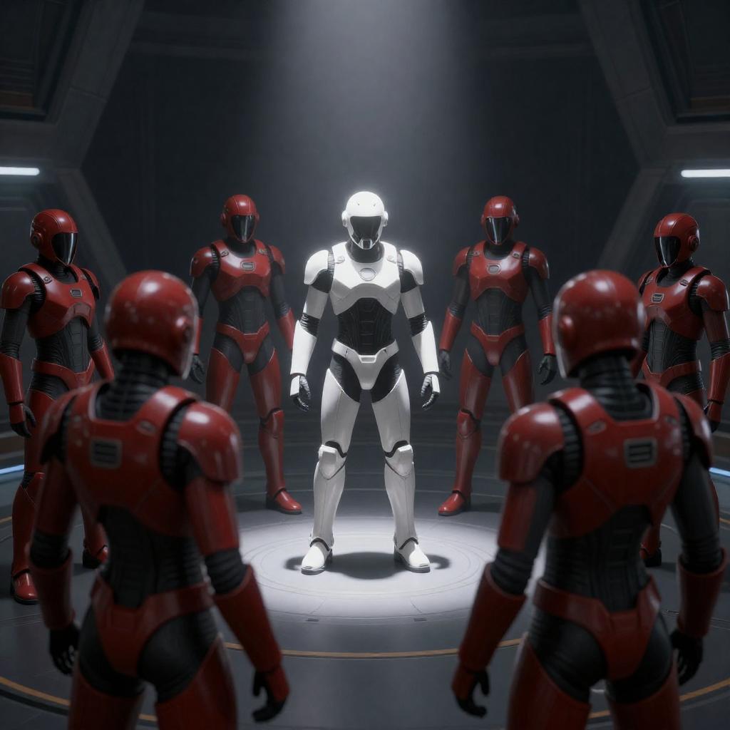 Futuristic Dim-Lit Laboratory with Armored Figures