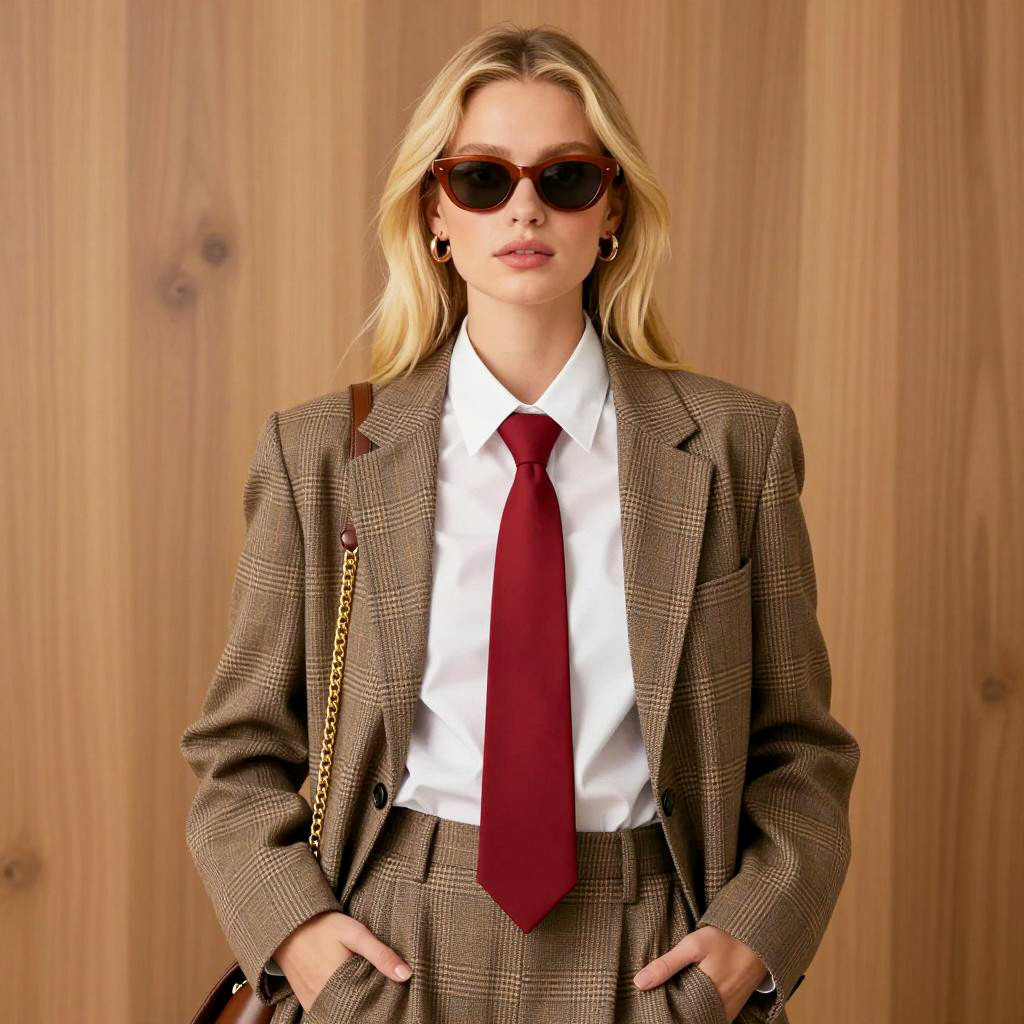Woman with long, wavy blonde hair, wearing red knit top with gold buttons, black necktie, and black sunglasses. She has fair skin, pink eyeshadow, dark eyeliner, red lipstick, and is smiling with teeth showing. Red background. Right hand adjusting sunglasses.