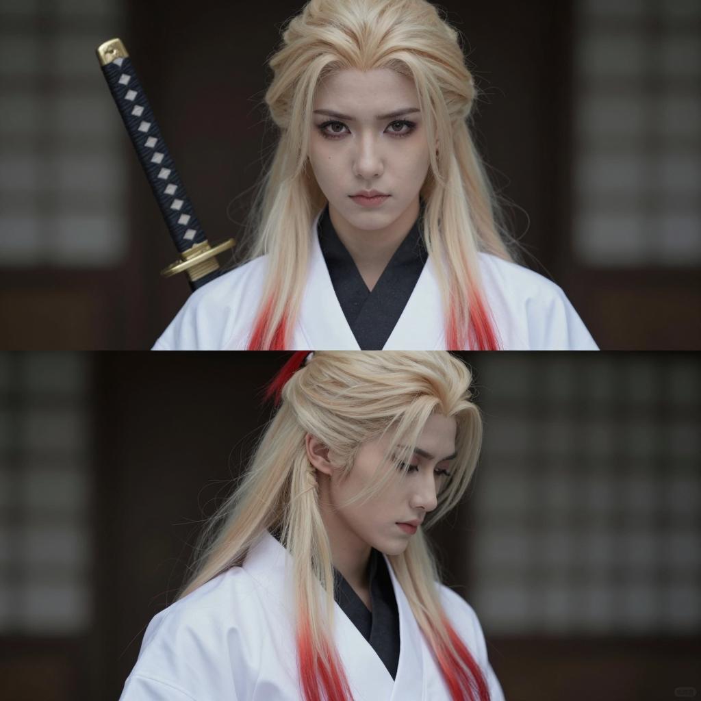 Two-part photograph of a white person with long blonde hair, red tips, and heavy black eyeliner. Upper image: side profile, serious expression, white jacket, sheathed katana on left shoulder. Lower image: profile, downward gaze, same white jacket, dark background.