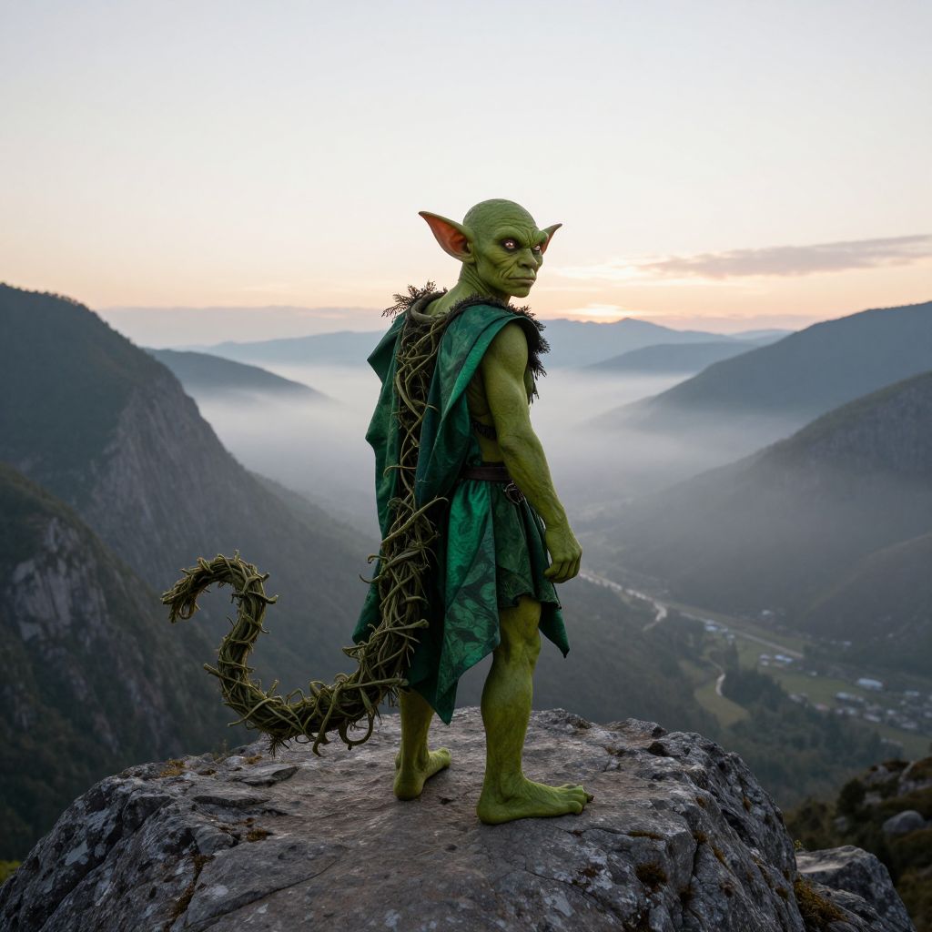 Photorealistic digital artwork of a green-skinned, goblin-like creature standing on a rocky mountain peak at sunrise. The goblin has large pointed ears, a scaly tail, and wears a tattered green cloak with thorny vines. It gazes over a misty valley with rolling hills and a winding river below. The sky is a gradient of soft orange and pale blue, indicating dawn. The goblin's expression is neutral, and it stands with one foot slightly forward, emphasizing its muscular build. The texture of the rocky surface contrasts with the smoothness of the goblin's skin and cloak.