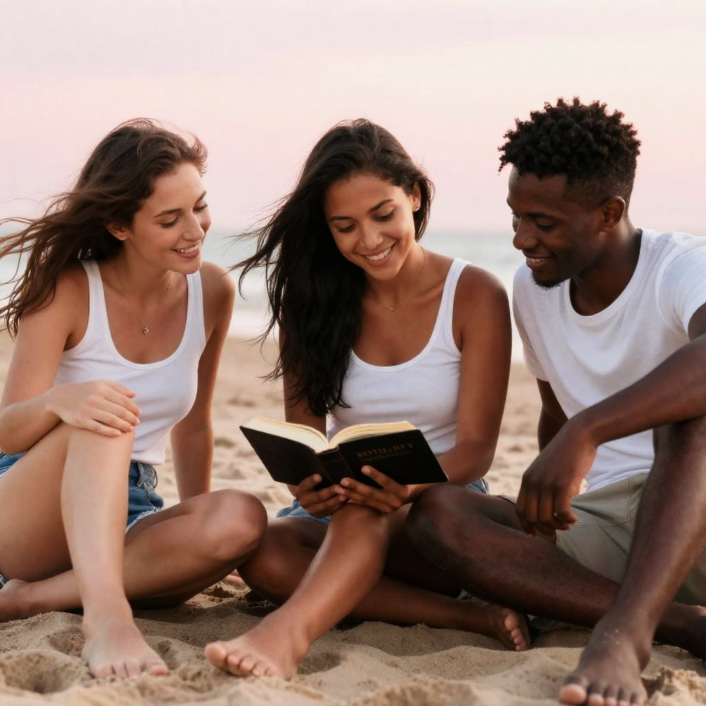 Realistic photo.Glow of an ethnically diverse group, including Asians, of three friends in their mid thirties sitting together on a beach studying the bible. Wearing comfortable beachwear. Slight breeze. Happy uplifting. Golden hour with a light green tint. Photorealistic image. realistic photo