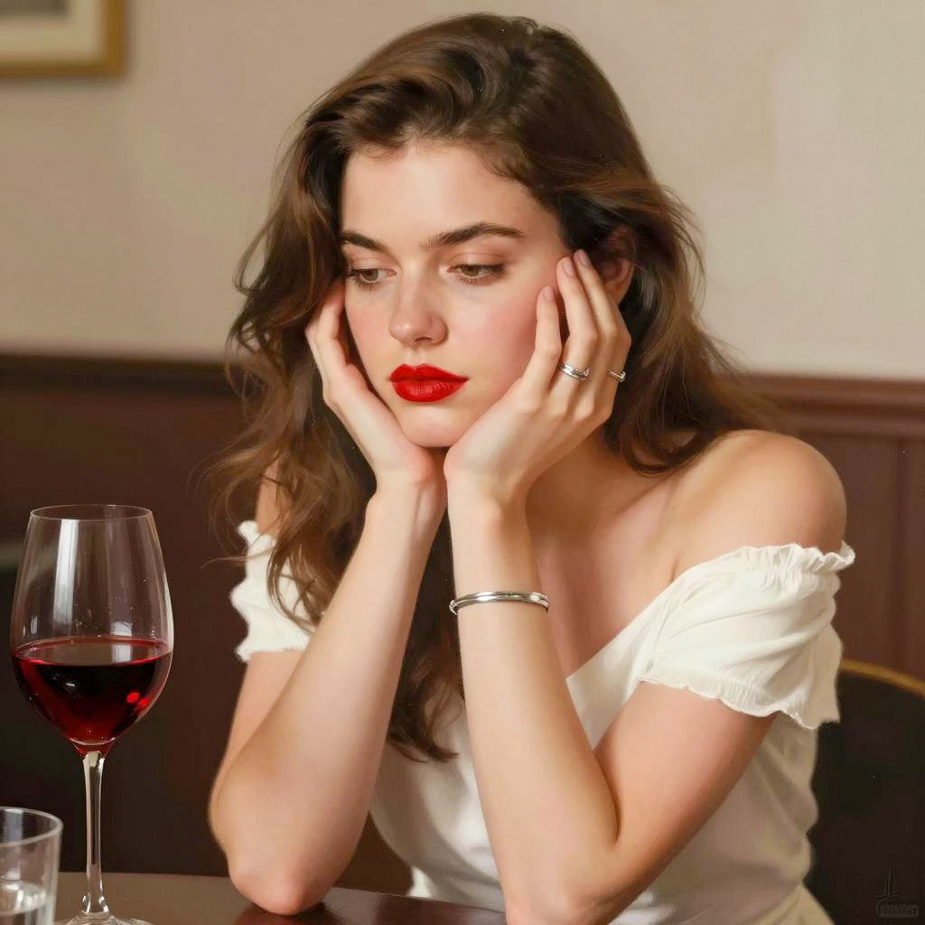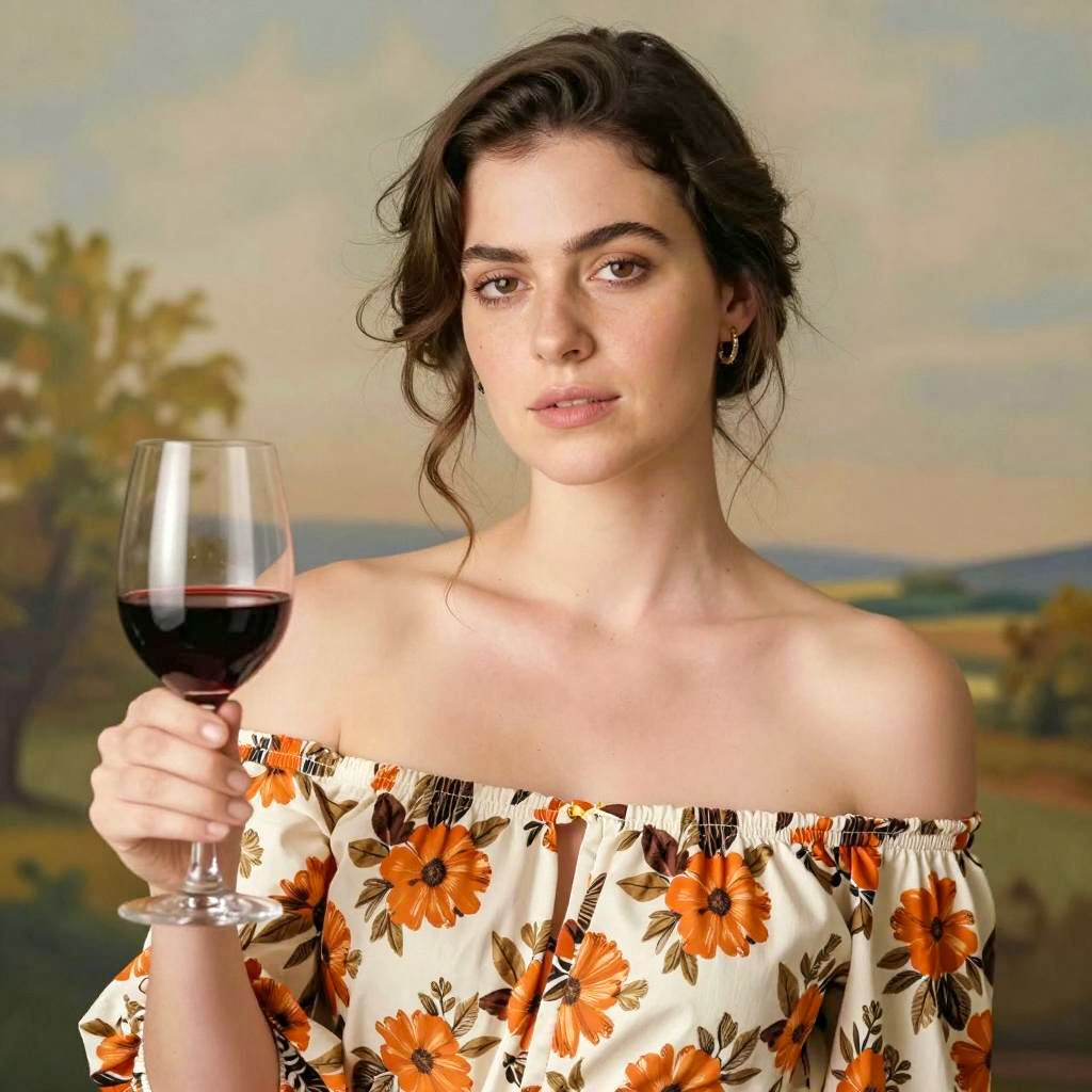 Woman with light skin, brown hair in a ponytail, smiling, wearing an orange jacket over a black turtleneck, holding a glass of red wine, right hand resting on her head, black chair, dark background, dim lighting.