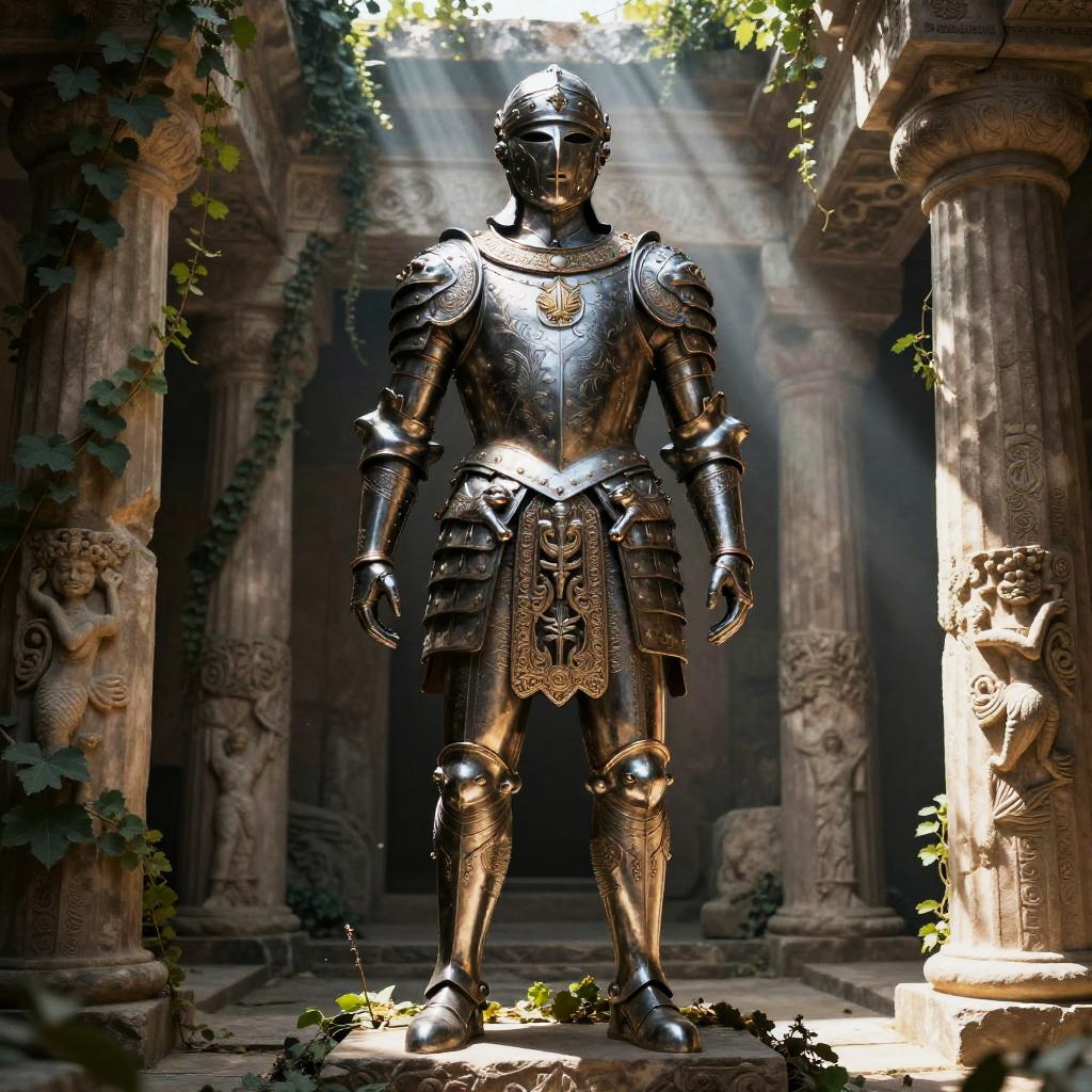 Fantasy Greek armor displayed on a statue in a forgotten temple, ornate with intricate filigree and mythical beasts, shimmering under shafts of divine light filtering through cracks, surrounded by ivy and ancient stone carvings, evoking a sense of timeless heroism.