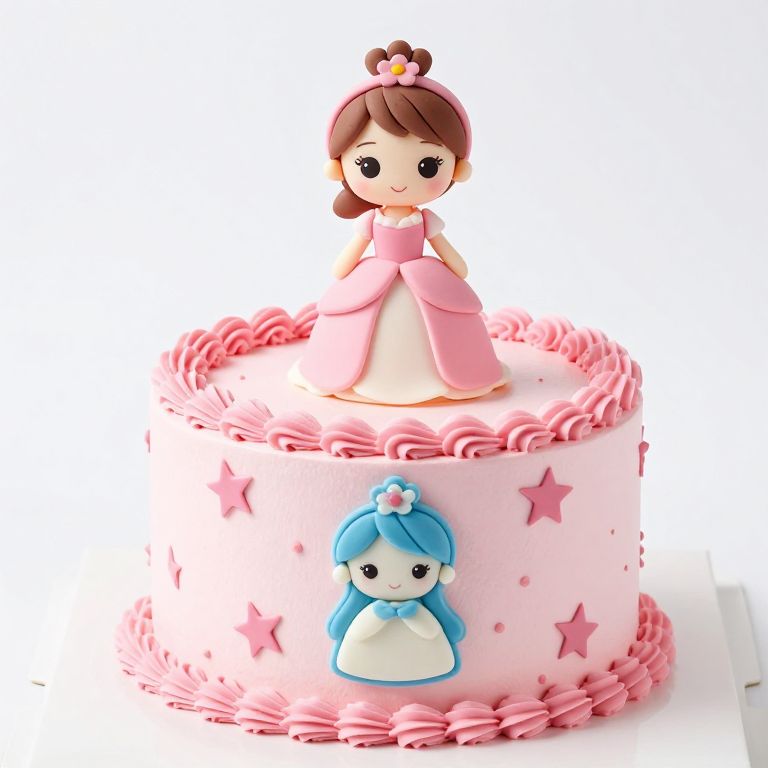 Photograph of a pink-themed birthday cake with a brown-haired, pink-dress fondant princess on top and a blue-haired, white-dress fond