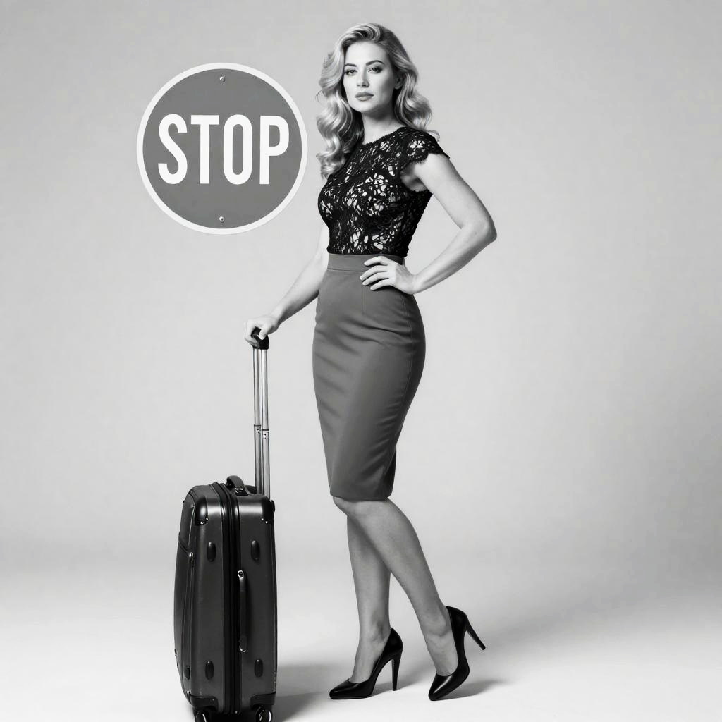 Blonde woman in black turtleneck and skirt, sitting on a cream chair, next to two large brown suitcases with leather handles, wearing black shoes. Light gray gradient background. She smiles slightly, legs crossed, hands on lap.