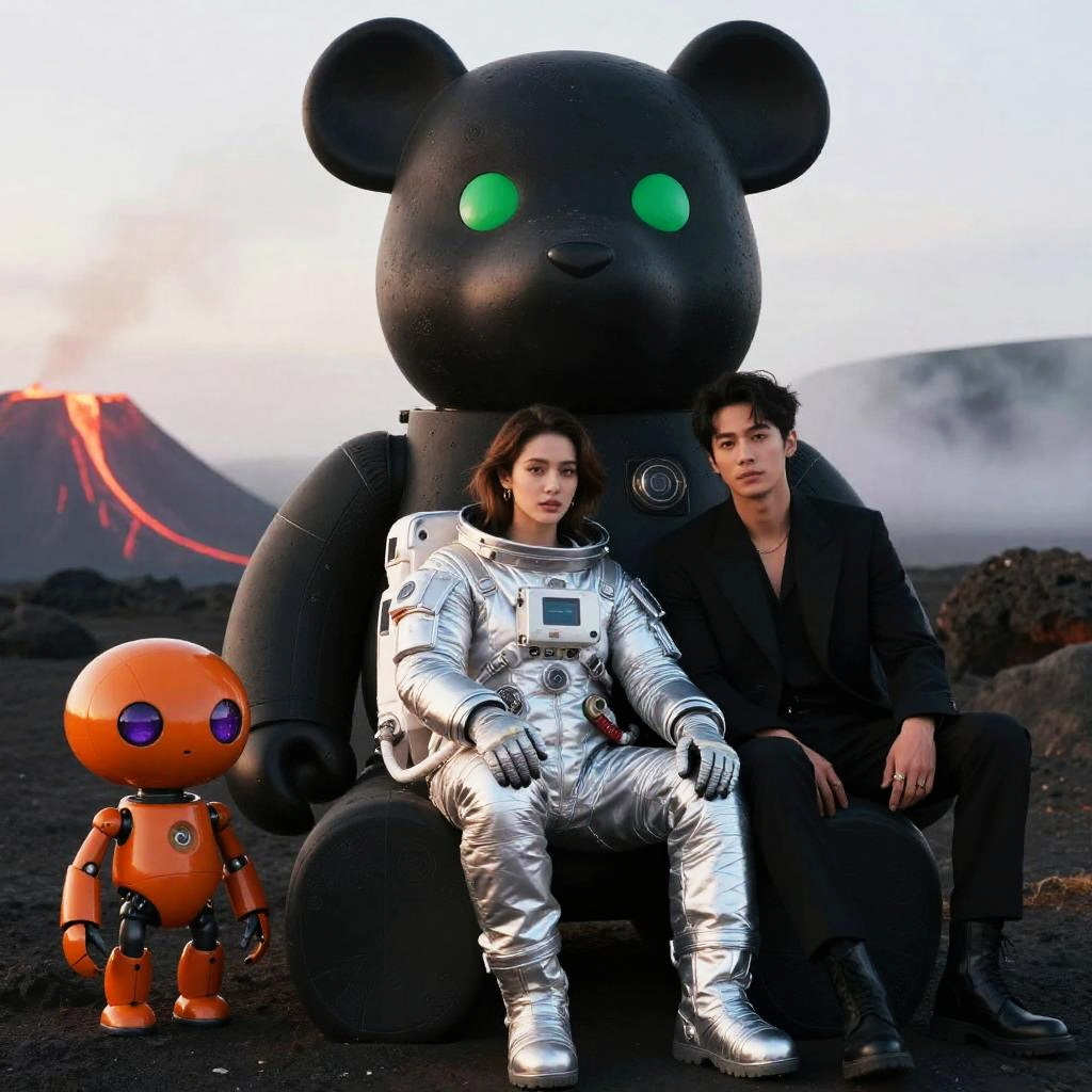 Realistic photo.Functional Art photo of an attractive female astronaut sitting beside a massive black robotic bear with green eyes, on the left side is a small orange robot alien with purple eyes, the woman is looking into the lens, woman has long brown hair and wears a silver modern space suit, full body picture, editorial style, man wears a black modern blazer, natural face, active volcano and lava in the background, fog, golden hour, cinematic, futuristic, hyperrealistic. realistic photo