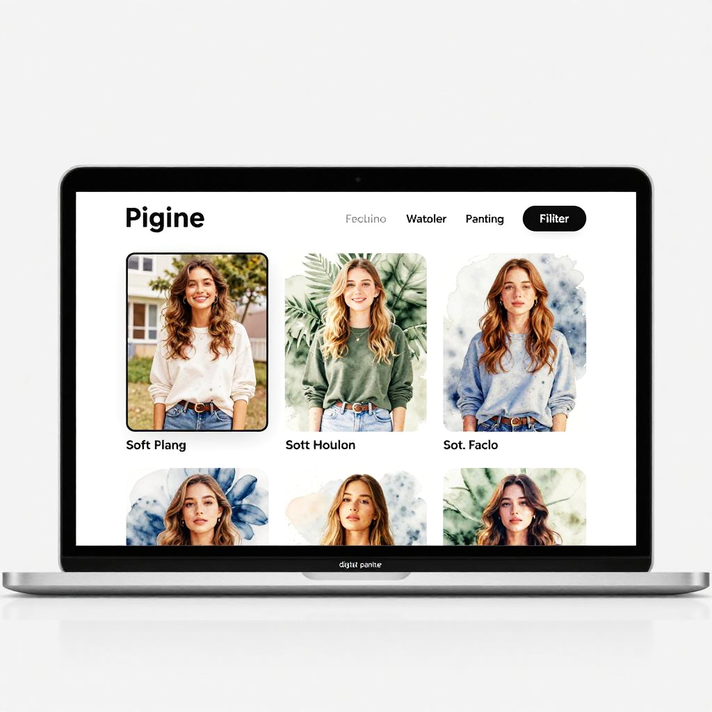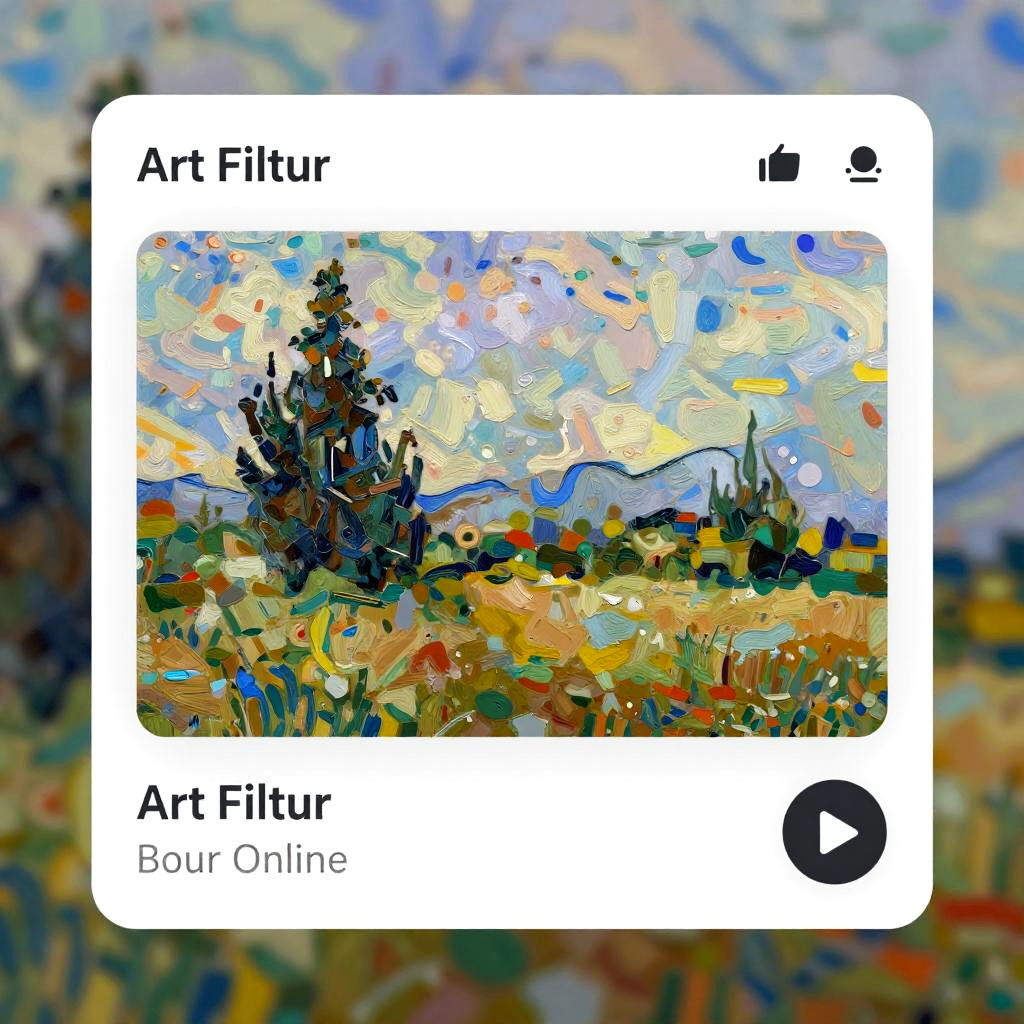 Online painting filter application transforming ordinary photographs into stunning impressionist artworks, with rich brush textures, dynamic color blending, and a sleek web interface highlighting artistic photo editing tools.