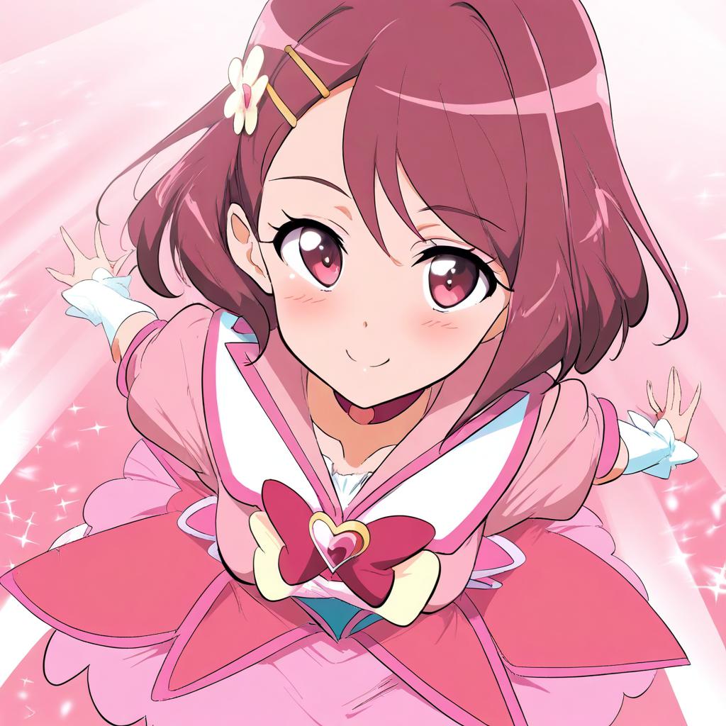 Hanadera nodoka, healin' good precure, 1girl, pink eyes, short hair, pink hair, brown hair, hair flower, hairclip, magical girl, magical girl, by artist momio, animagine