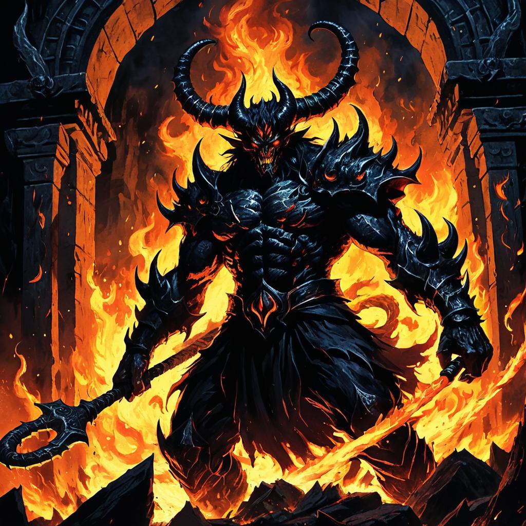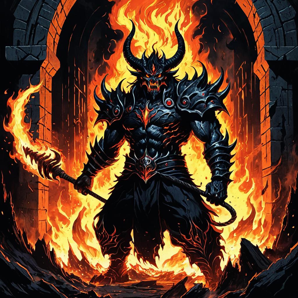Illustration of an infernal demon lord with molten skin and jagged obsidian horns, emitting smoke from its eyes. The dark anime-style figure stands menacingly in burning gates of a fire-ravaged underworld, wielding a whip made of living fire. The demon's spiked black armor is highlighted by intense flames surrounding it, evoking a powerful and terrifying presence.