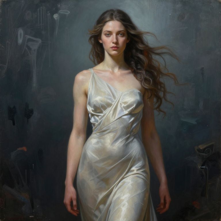 This is a digital painting of a young woman with long, wavy brown hair, fair skin, and a slender physique. She wears a shimmering, silver satin dress with one shoulder strap, draped elegantly over her body. The background is dark and abstract, with subtle, sketch-like elements. Her expression is serious and her gaze is directed slightly to the right. The lighting highlights the smooth texture of the dress and the soft waves of her hair, creating a contrast with the darker, shadowy background. The style is realistic with a touch of romanticism, emphasizing the ethereal beauty of the subject.