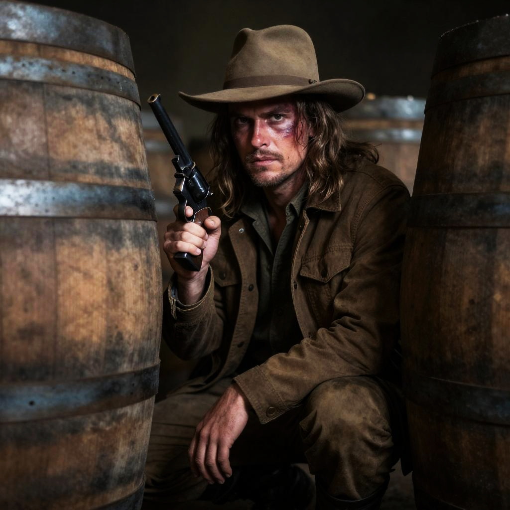 Photograph of a rugged man with long brown hair, wearing a tan hat and brown jacket, crouching between wooden barrels. He holds a black and gold revolver in his right hand. His expression is intense, with a slightly bruised face. Two large wooden barrels frame him on both sides.