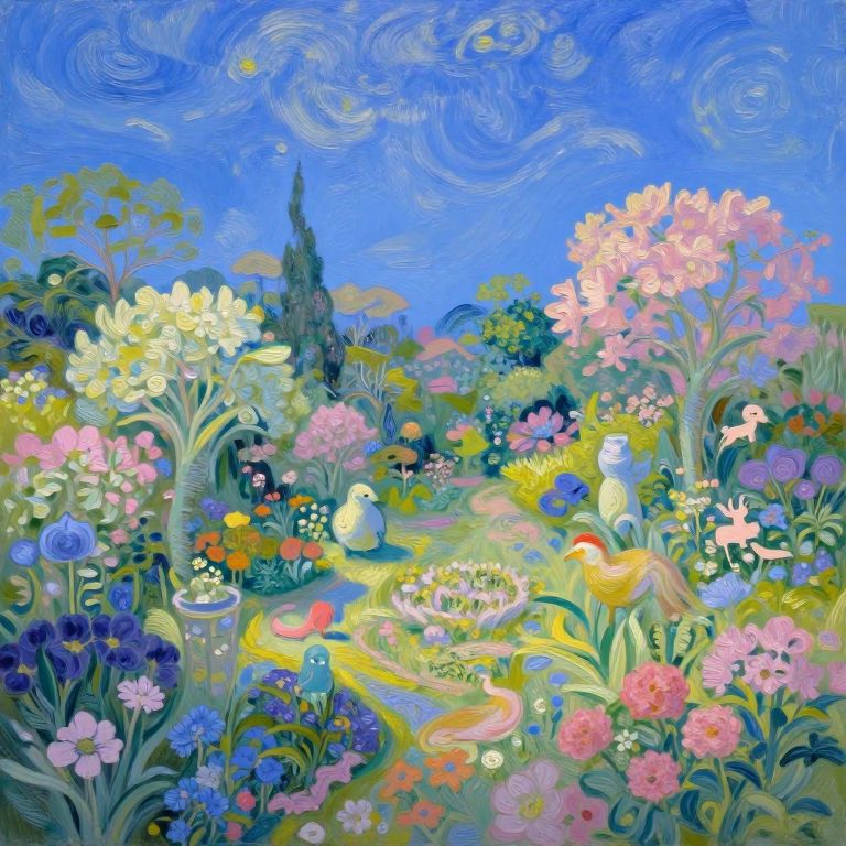 A surreal digital painting portrays an enchanting garden ascending towards a clear blue sky, seamlessly transitioning from earthly paradise to infinite expanse above. From an aerial viewpoint, observe the intricate flora and fauna woven within this mystical realm, each element imbued with magic and enchantment. The color palette features rich, vivid hues contrasting soft pastel tones, evoking awe and tranquility that invites exploration into one's imagination. This dreamlike landscape captures a sense of wonder and curiosity about what lies beyond our familiar world, while the brushstrokes reminiscent of van Gogh's style add depth and movement to the ethereal scene.
