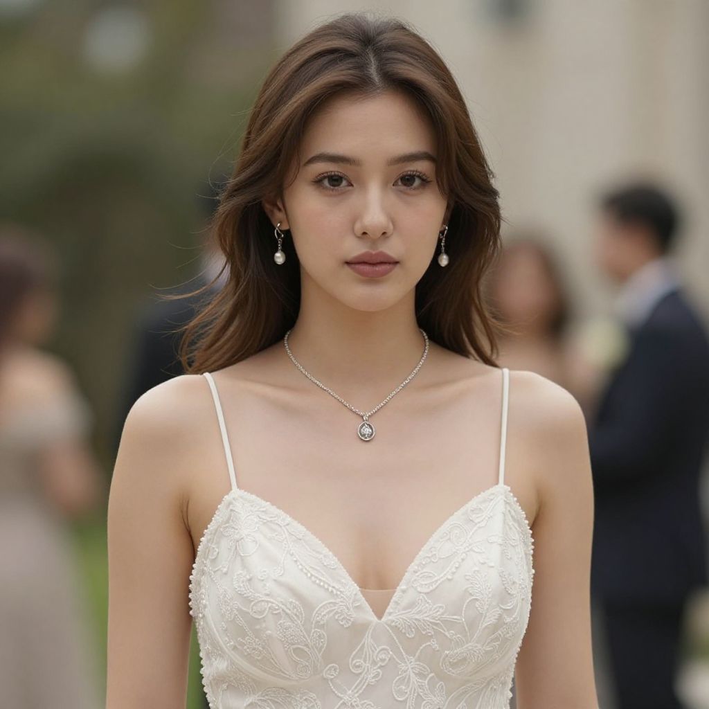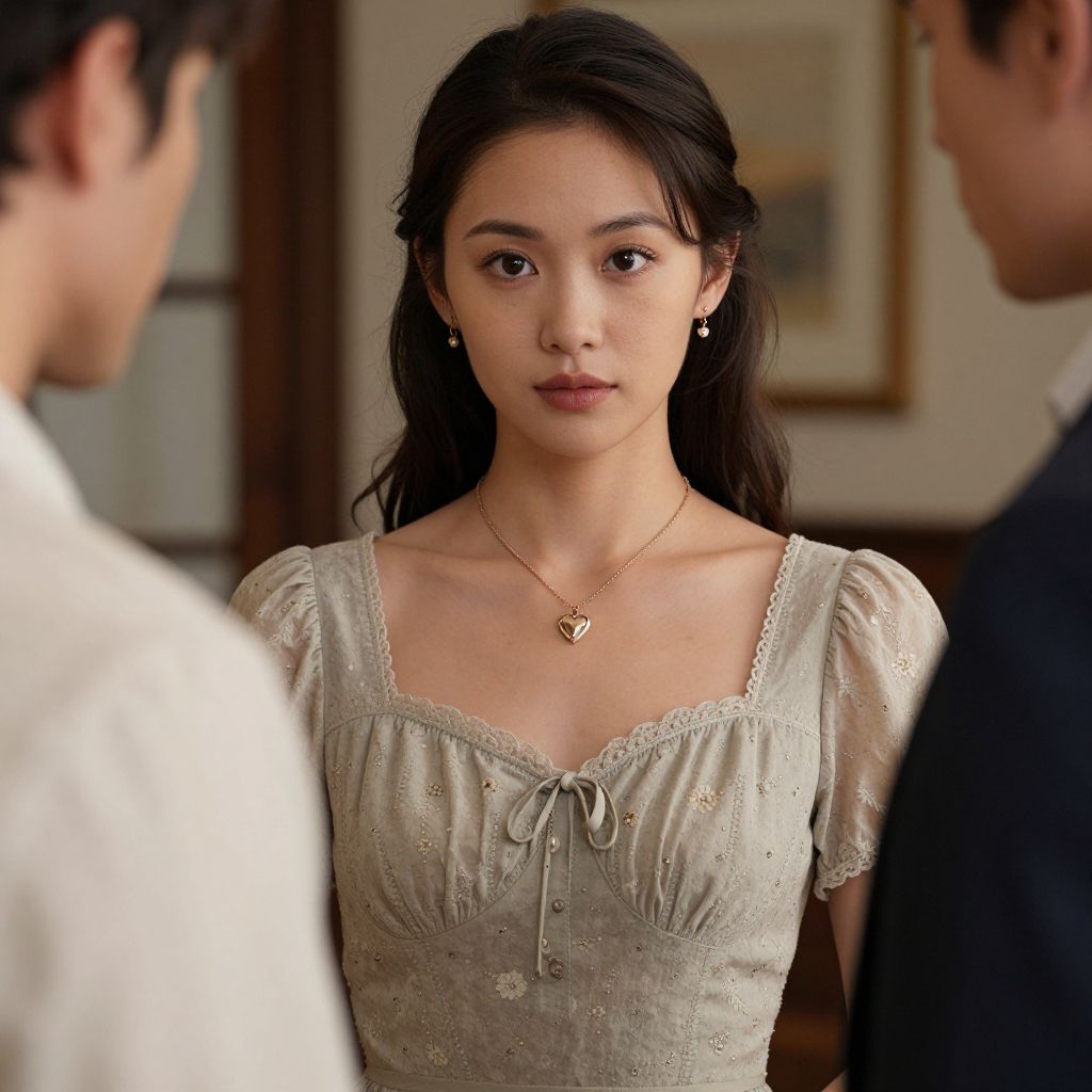 Woman wearing a vintage-style dress and delicate jewelry, including a heart-shaped pendant necklace, stands between two individuals in a softly lit room, exuding a sense of elegance and poise.