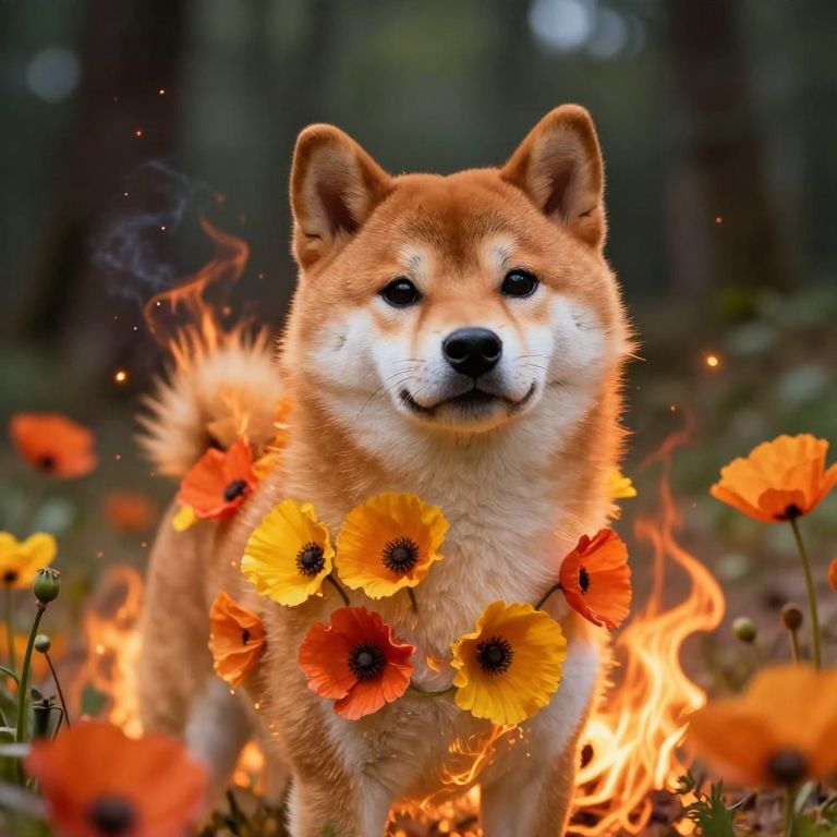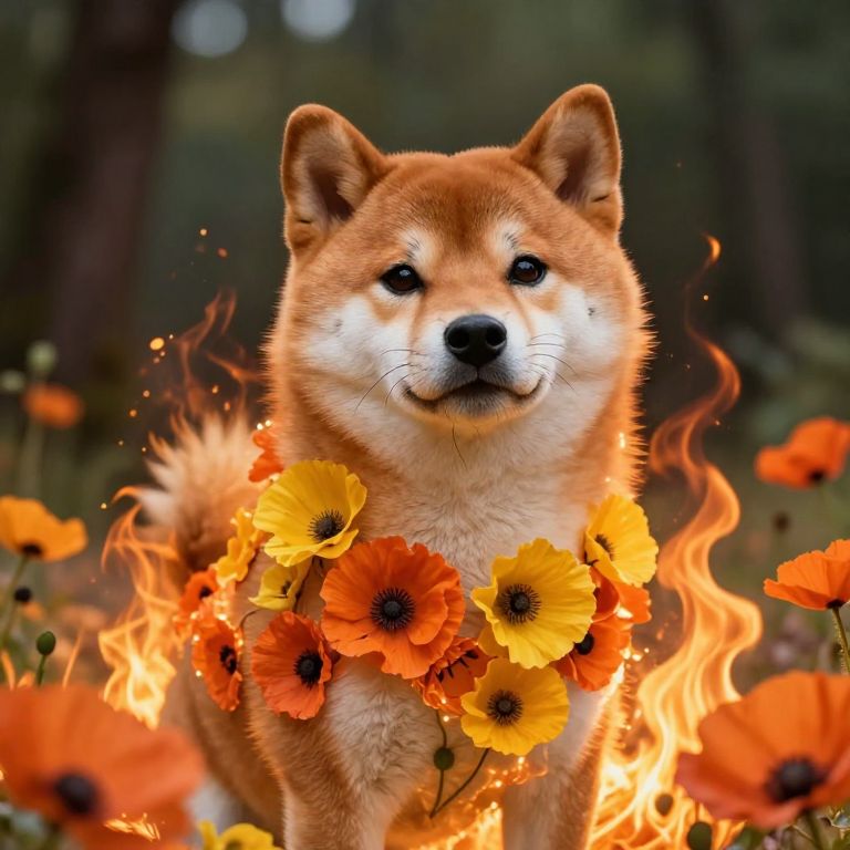 The image presents a highly detailed and enchanting scene featuring a Shiba Inu made of poppy flowers and fire. The Shiba Inu, with its two large, expressive eyes and a loving gaze, is the central figure, exuding a magical and heartwarming aura. The poppy flowers, in shades of orange and yellow, are intricately woven into the dog's fur, adding a vibrant contrast to the fiery elements. The fire, depicted with realistic flames, surrounds the Shiba Inu, creating a sense of warmth and intensity. The background is a dark, blurred forest, which enhances the magical atmosphere and draws the viewer's attention to the Shiba Inu. The overall composition is balanced, with the Shiba Inu positioned centrally, and the poppy flowers and fire creating a harmonious interplay of colors and textures. The image is a stunning blend of nature and fantasy, capturing the essence of the Shiba Inu in a visually captivating manner.