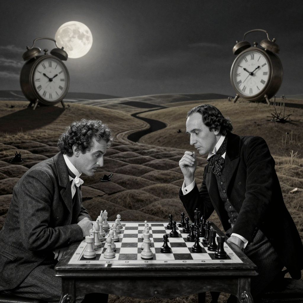 Envision a surreal landscape where time seems to bend and flow, reminiscent of Dali's dreamscapes. In the foreground, an otherworldly chess game is in progress between two enigmatic figures dressed in Victorian garb, their expressions revealing a fusion of deep concentration and ethereal detachment. The scene is bathed in an eerie moonlight that casts elongated shadows across the quilt-like terrain, creating an air of intrigue and mystery. This unique composition evokes a blend of nostalgia and wonder, inviting viewers to delve into the enigmatic nature of time as it intertwines with human endeavors and creativity.