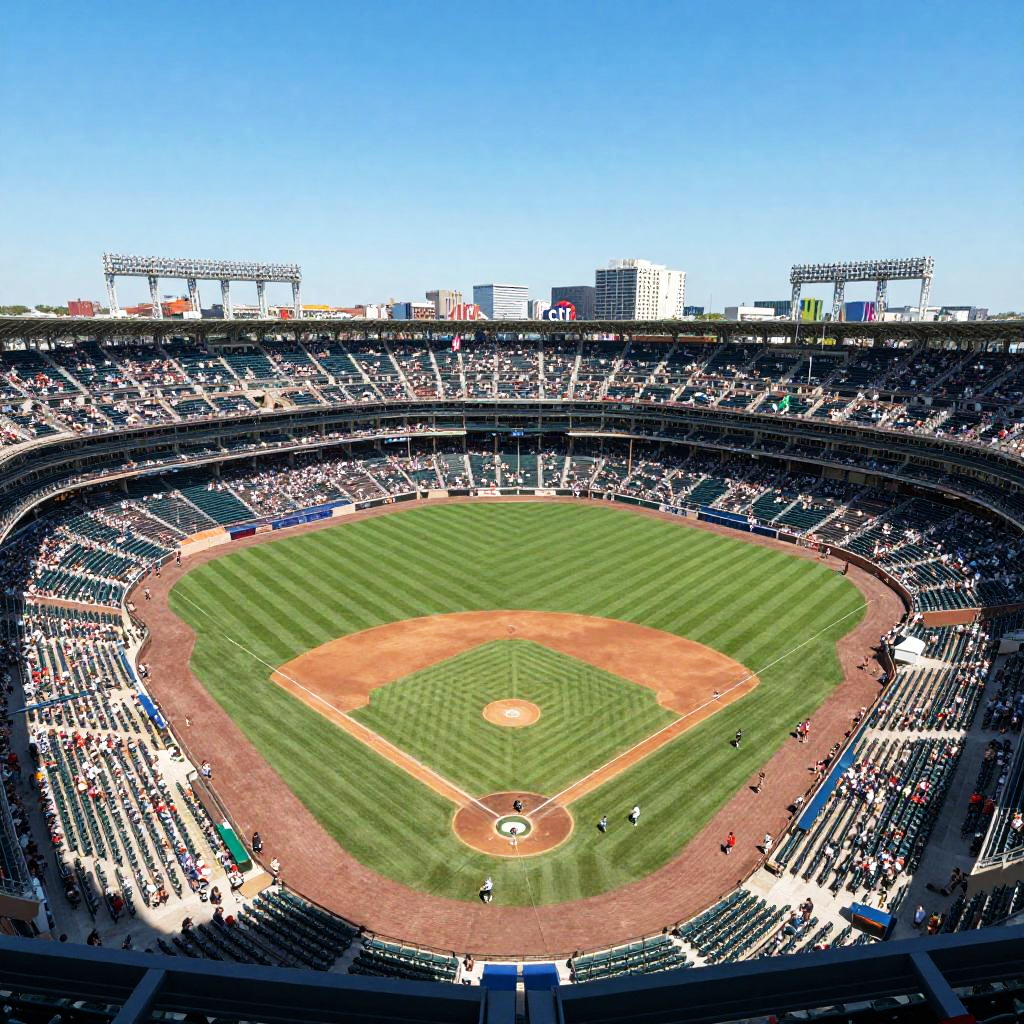 Aerial photograph of a large, empty baseball stadium with a neatly mowed field, surrounded by dark blue seats, and a city skyline of tall skys