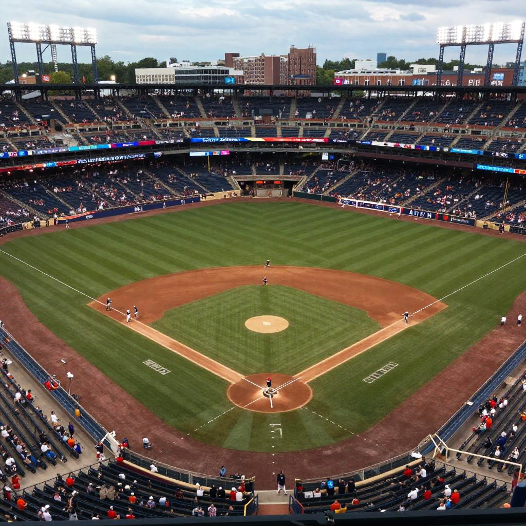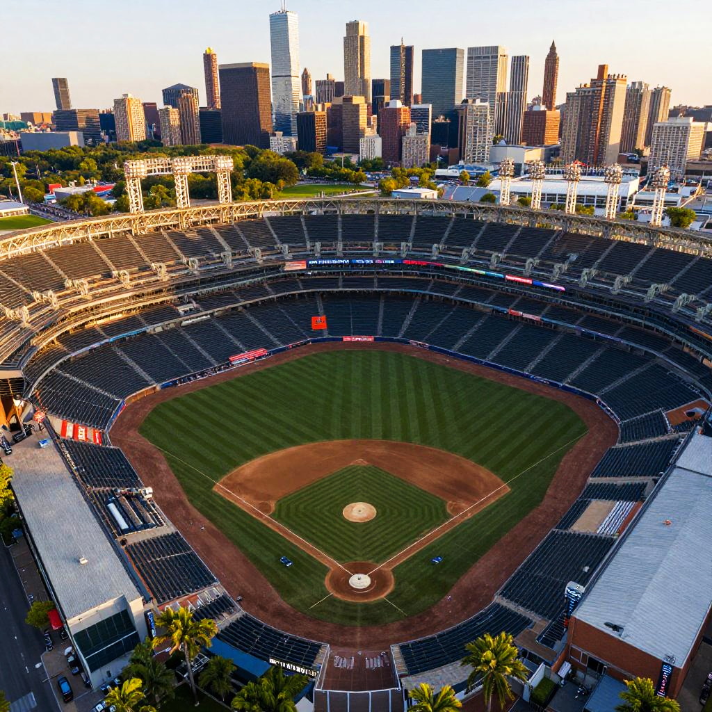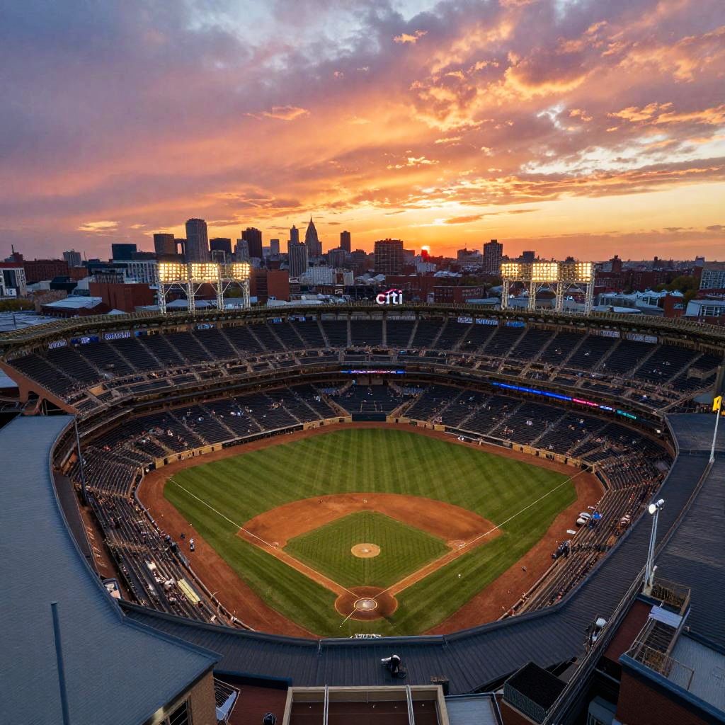 Citi Field aerial view at golden hour, vibrant stadium surrounded by lush urban greenery, detailed textures of the baseball field and stands, twinkling city skyline in the background, realistic lighting and shadows, ultra-wide perspective.