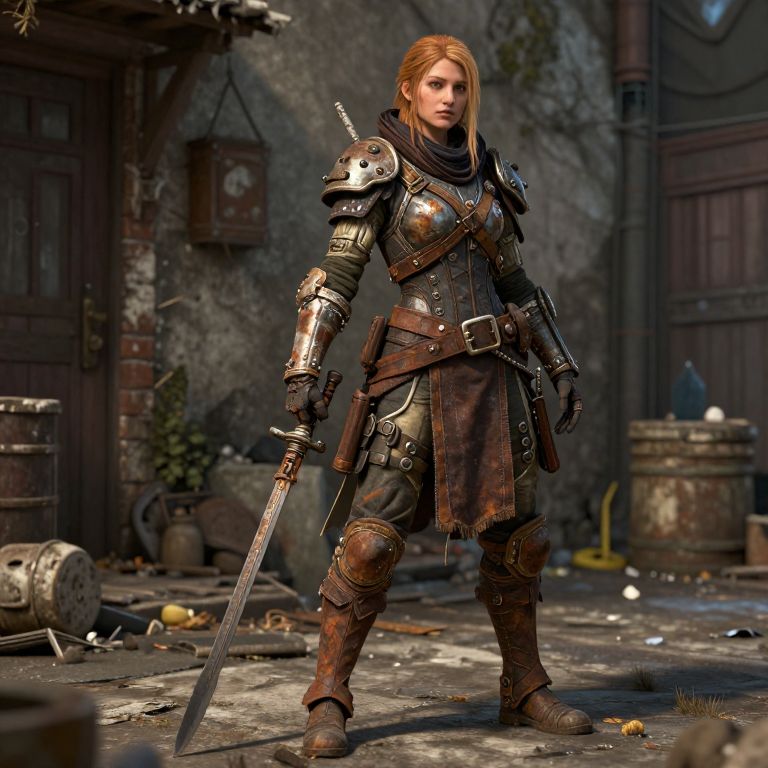A highly detailed CGI image of a blonde female warrior standing in a gritty, medieval-style alley. She wears dark, weathered steel armor with leather straps, a black scarf, and brown boots. Her right hand holds a long sword, while her left rests on her hip. The background includes a worn brick wall, wooden door, and scattered debris on the ground. Her expression is determined, and the lighting casts dramatic shadows, enhancing the realism and texture of her armor and surroundings. The alley is dimly lit, adding to the gritty atmosphere.