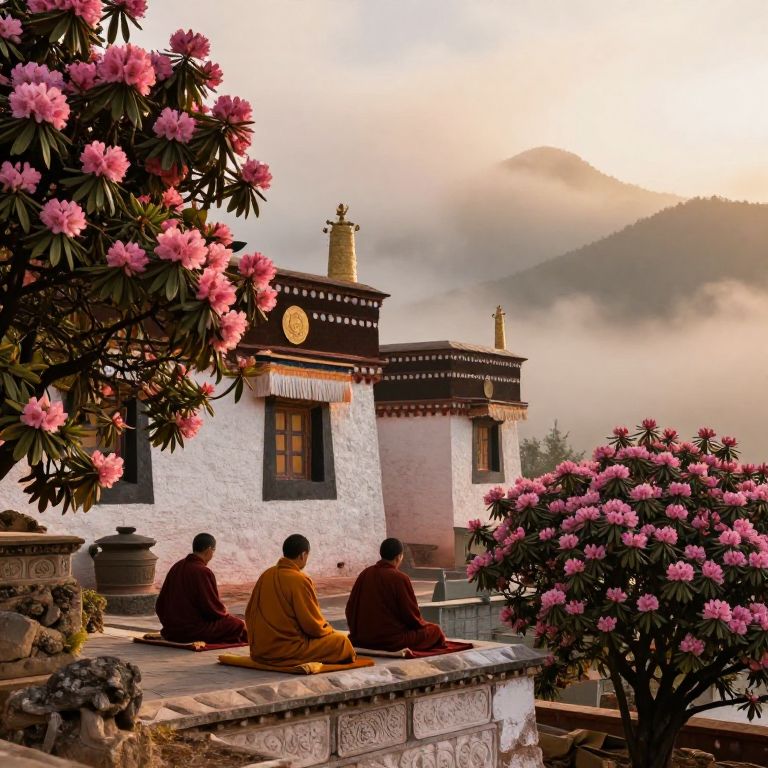 Llasa ancient monastery surrounded by blooming rhododendrons, intricate stone carvings on the walls, monks in saffron robes meditating under the warm golden light, misty mountain backdrop with soft glowing sunrise, atmospheric and tranquil scene
