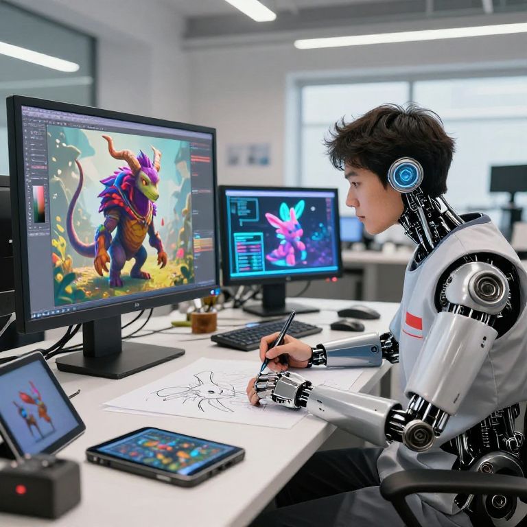 Photorealistic digital art: Young man with cybernetic arms drawing Pokémon-style creature on white desk, surrounded by three monitors with colorful digital art.