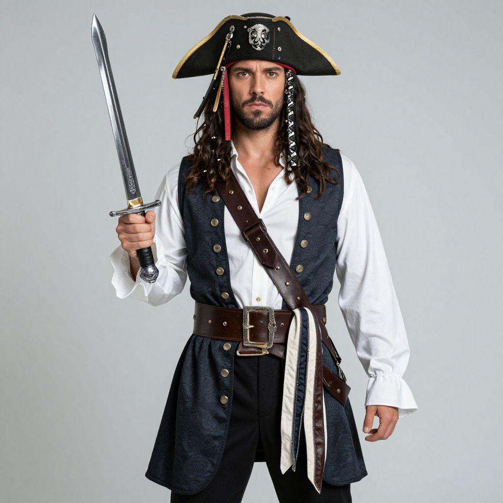 Pirate Attire Male Costume, man in a pirate costume with a hat and a sword