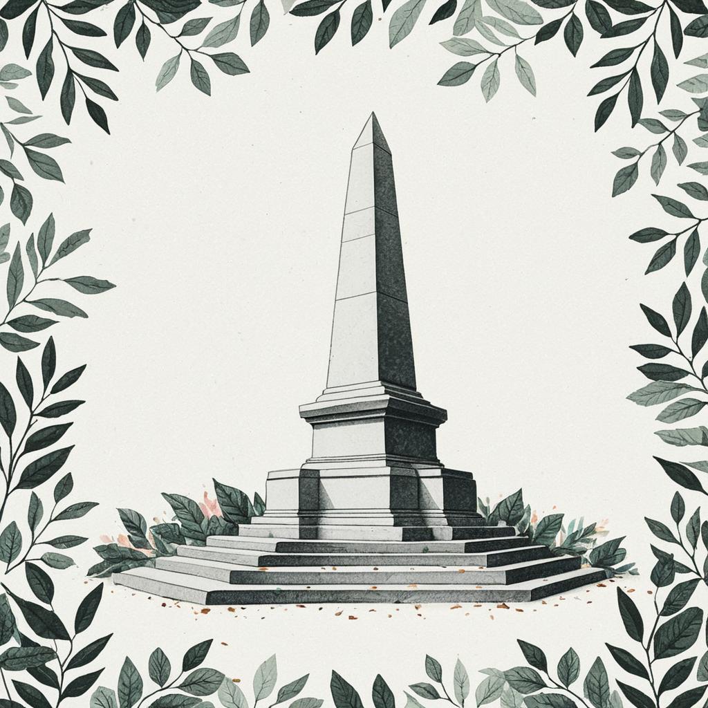 Stylized illustration of a classical monument with a tiered base and an obelisk shape, surrounded by soft pastel-toned leaves arranged irregularly as a decorative frame on a white background. The design features skin-friendly aesthetic with a calm and hierarchical layout emphasizing nature elements.
