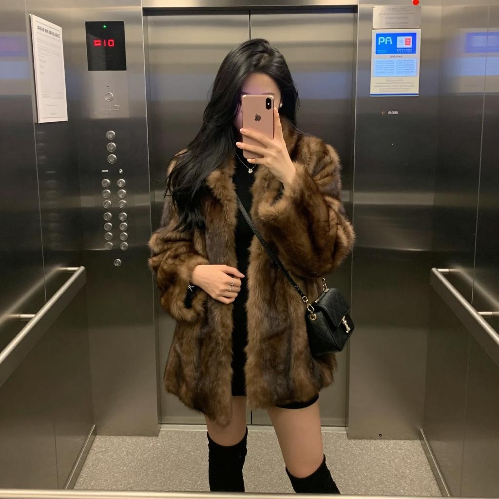 Woman with long black hair taking a mirror selfie in a elevator. She wears a dark brown fur coat, black top, black thigh-high socks, and a small black crossbody bag. She holds an iPhone in her right hand, covering her face. The elevator walls are dark with metallic accents. Her left hand holds the coat at her waist. The elevator has a beige carpet floor.
