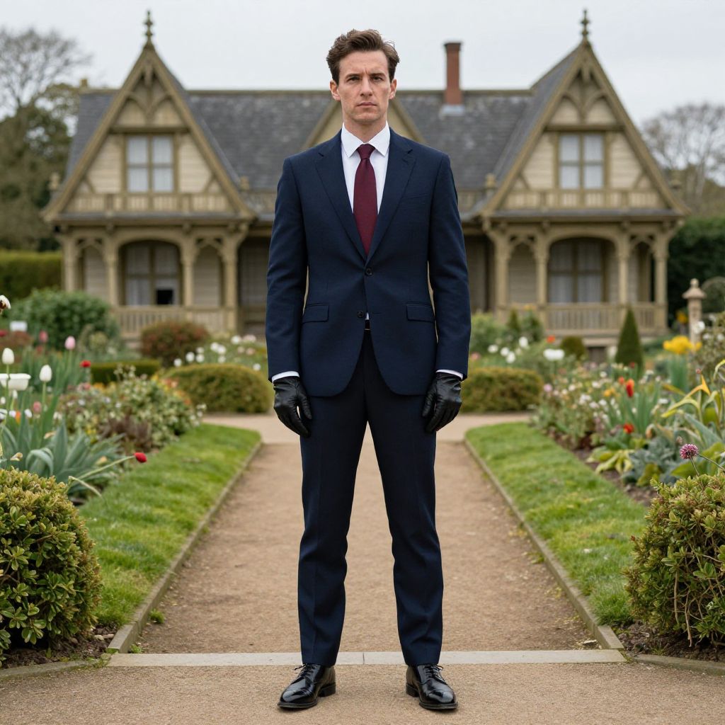 A man, navy tailored suit, crisp white dress shirt, deep burgundy silk tie, black leather gloves, polished oxford shoes, Victorian architecture, ornate gables, lush garden pathways, camera obscura style, contemplative expression. Man has masculine face and piercing eyes