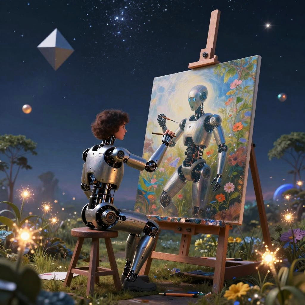 Ai art generator crafting a fantasy scene featuring a robotic artist painting an enormous canvas under a starry sky, surrounded by glowing flora and floating geometric shapes, blending sci-fi and magical realism with a dreamlike atmosphere