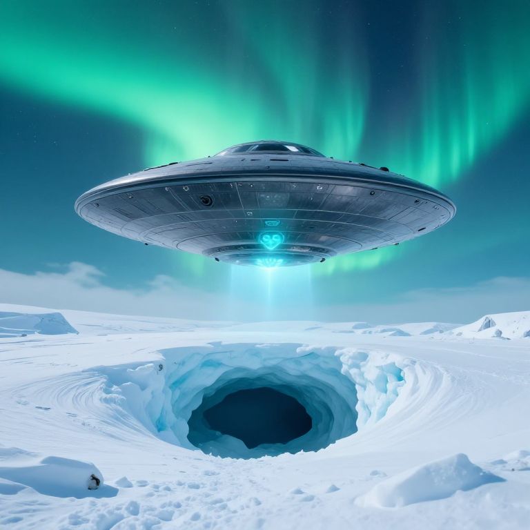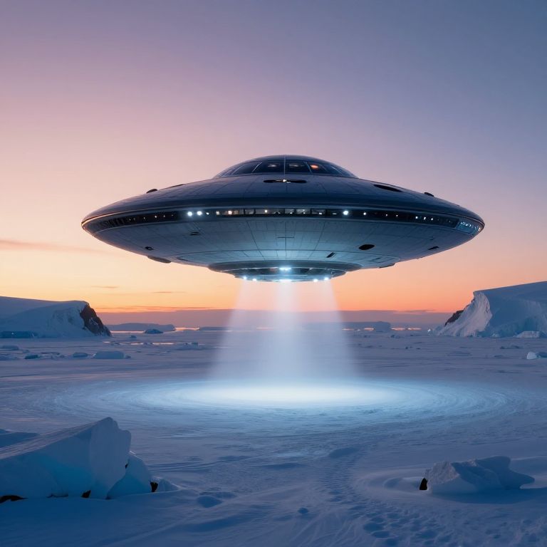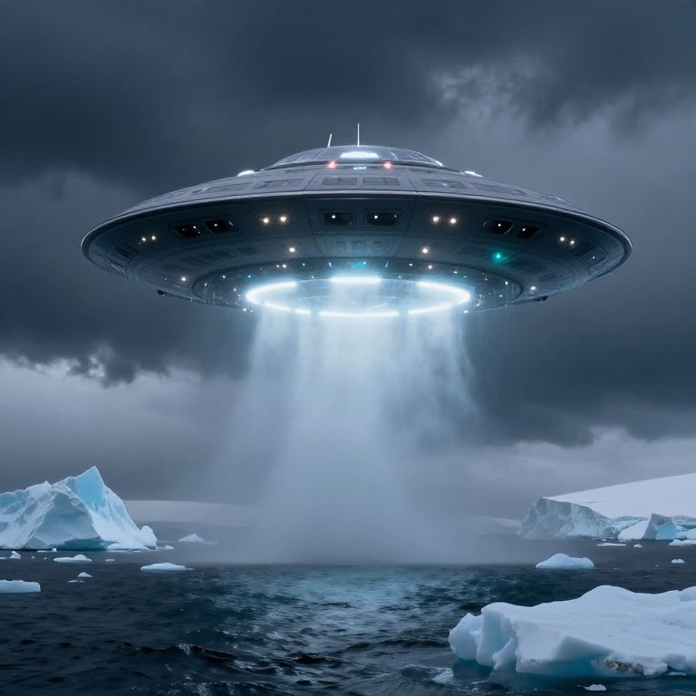 Photorealistic image of a glowing UFO hovering above icy ocean, illuminated by bright lights, with dark storm clouds in the background.