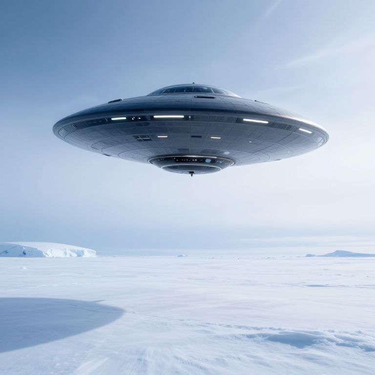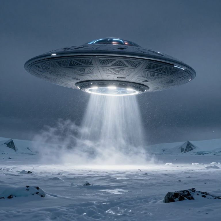 Photograph-style digital artwork depicting a futuristic, silver flying saucer hovering above a dark, stormy ocean. The saucer is illuminated by bright, white lights emanating from its underside, casting a luminous beam downward. Surrounding the saucer are jagged, floating icebergs in a deep blue, turbulent sea. The sky is filled with dense, dark clouds, contrasting with the saucer's sleek, metallic surface. The overall color palette includes dark blues, whites, and grays, creating a mysterious, otherworldly atmosphere. The image emphasizes the saucer's advanced technology against the natural, icy landscape.