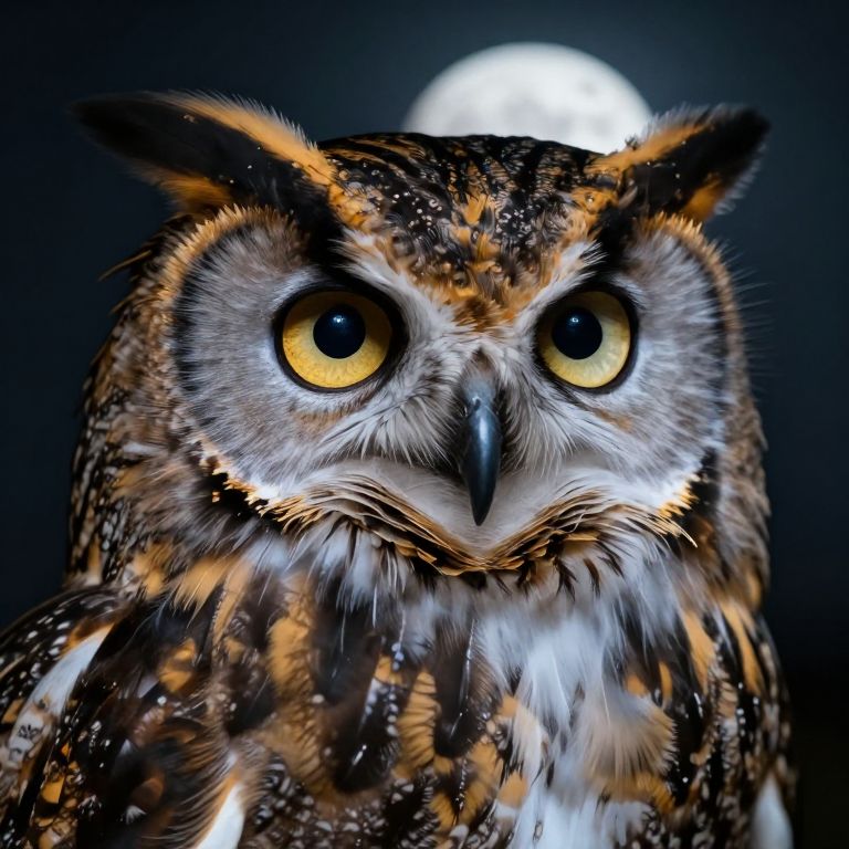 A majestic owl with iridescent feathers and golden accents stares intently at the moon, its piercing eyes revealing a mesmerizing reflection of the lunar landscape, creating an illusion of infinite depth and wonder.