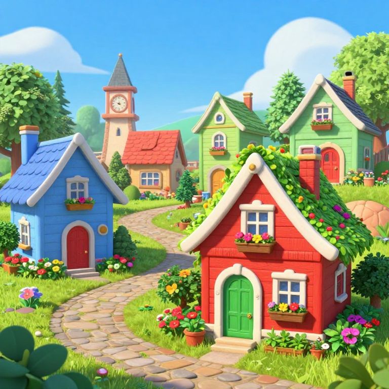 Bright, colorful, digital illustration of a whimsical village with red, blue, and green houses, a clock tower, and a winding stone path,