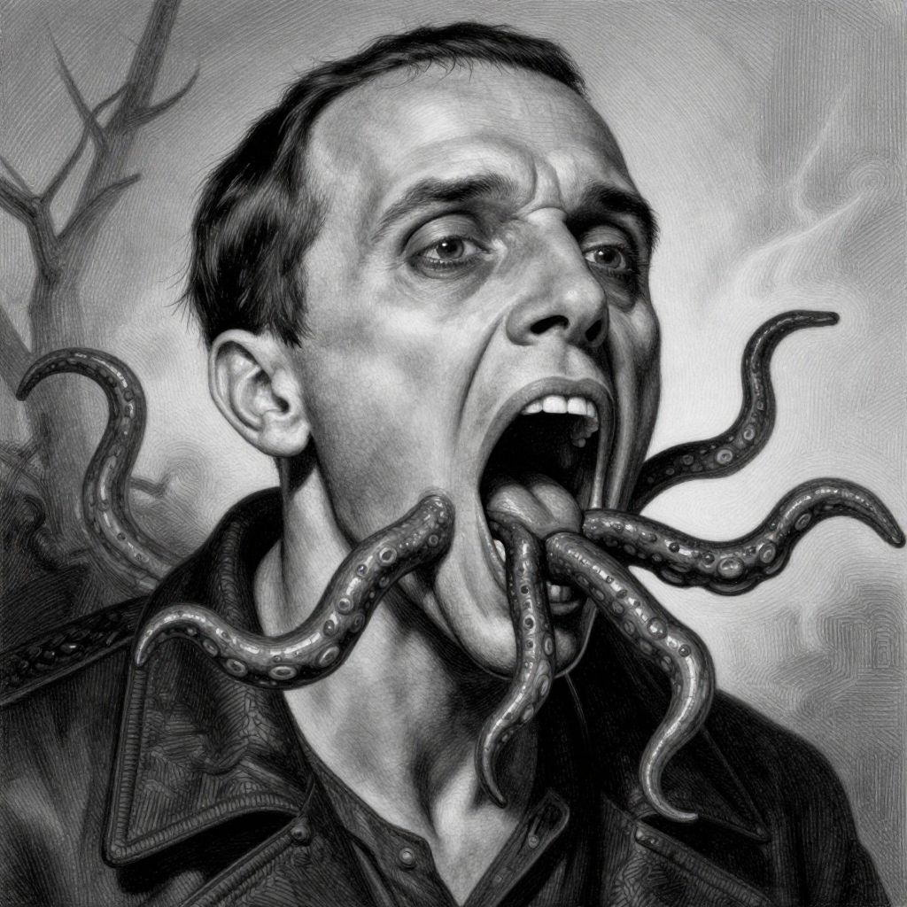 Black-and-white digital drawing of a horrified man with tentacles emerging from his mouth, wearing a jacket, against a textured background.