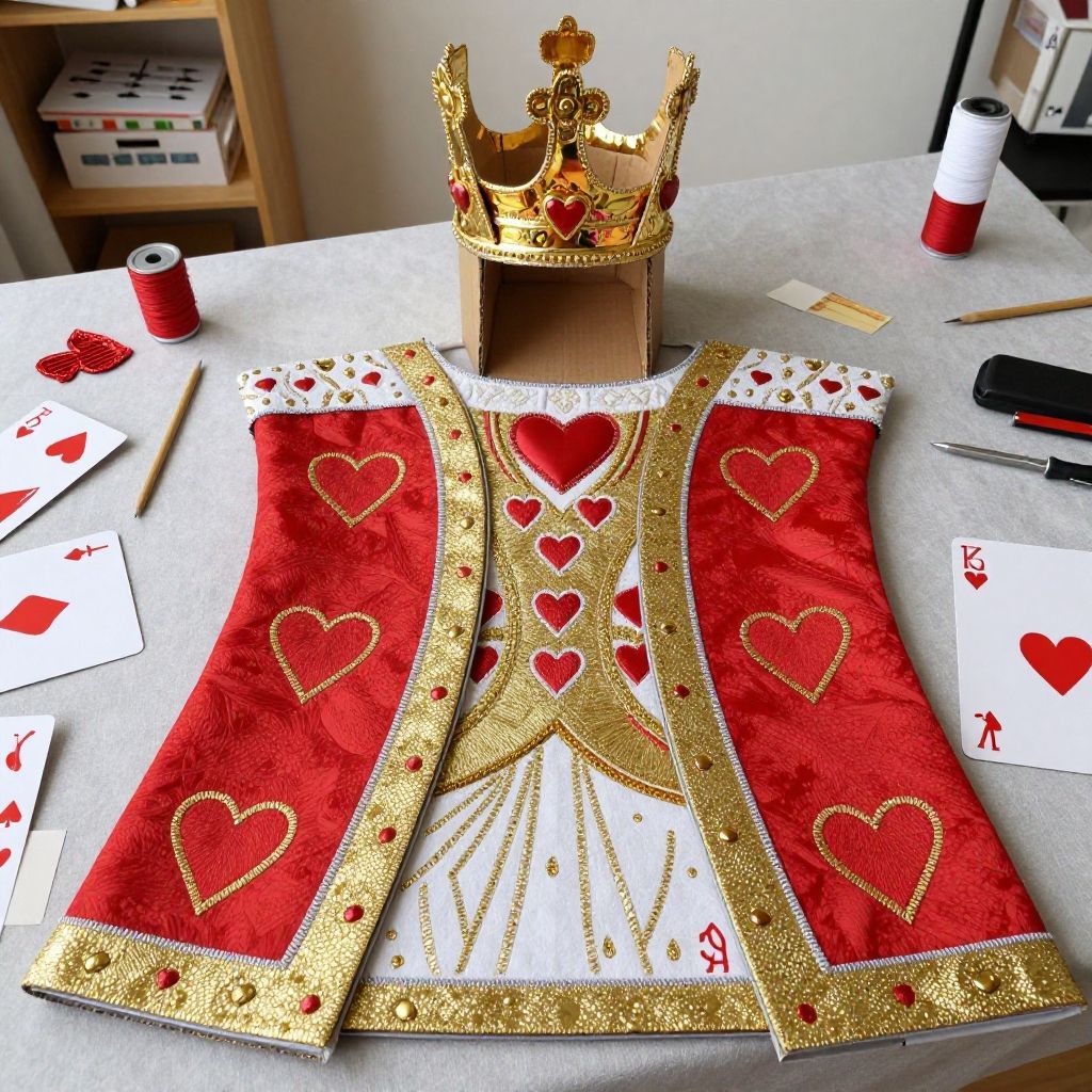 King of hearts costume DIY, detailed handcrafted regal outfit inspired by classic playing card design, vibrant red and gold fabric, intricate heart motifs embroidered, royal crown made from cardboard and foil, set in a cozy craft room with sewing tools and materials scattered