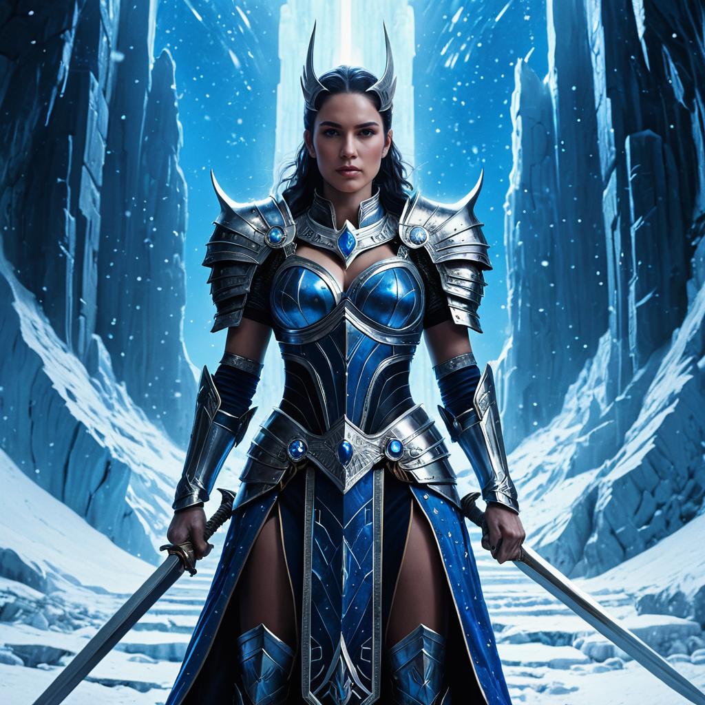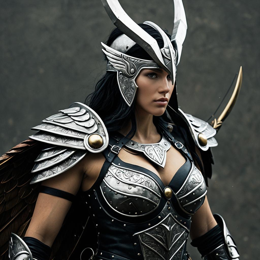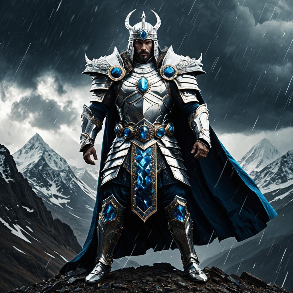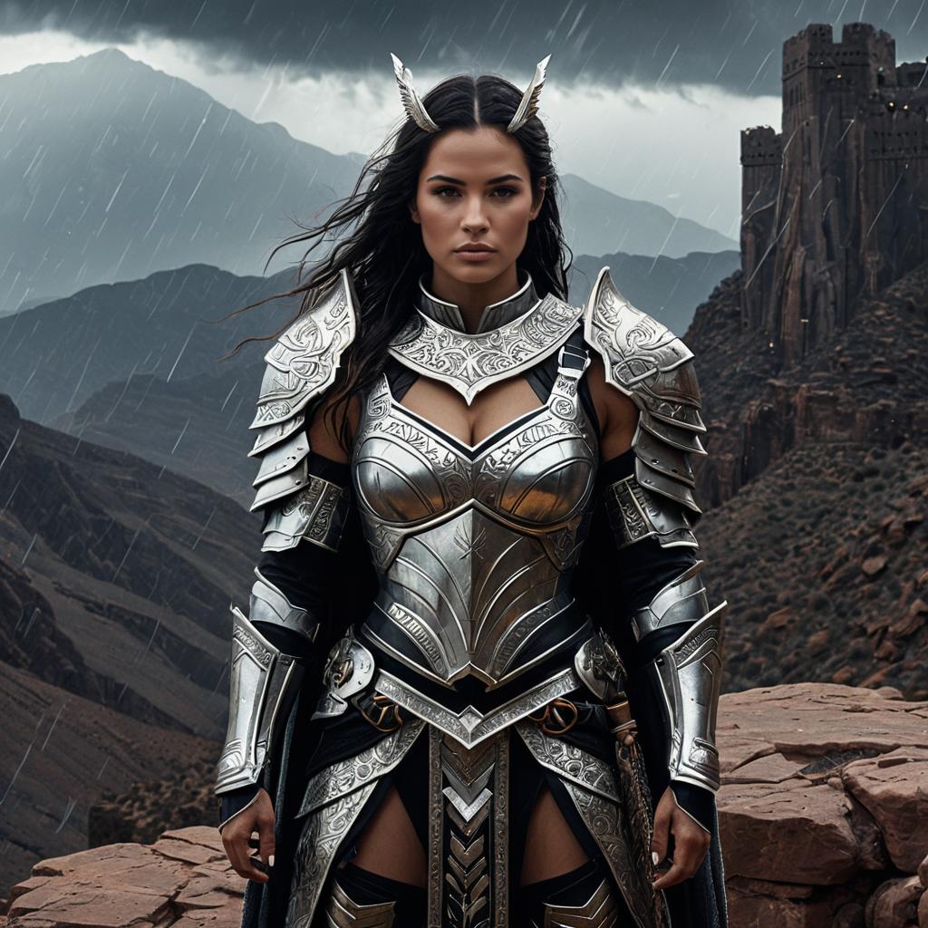 Epic painting, full-figure portrait of a fierce desert huntress, wearing ornate silver armor with intricate engravings, standing in a stormy mountain fortress atop jagged cliffs, symmetrical front-facing composition, dramatic rim lighting, ultra-high resolution detail, style influences by artgerm, wlop, jeremy lipking, beeple.