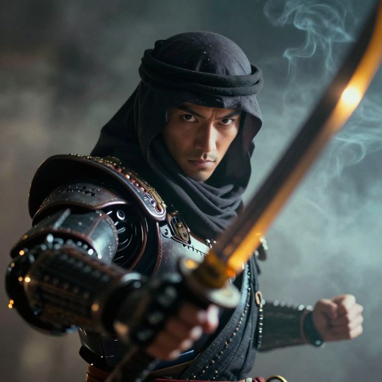 Closeup portrait photo of an Elysium Robot Cyborg Samurai, macro, a captivating vibrant dark capturing the essence of a cyborg Bedouin sorcerer in fight stance, Fist raised infront of japanese shire, ethereal, smoky backdrop, throwing a translucent amber/black, weapon, katana, holding katana, atmospheric haze, Film grain, shallow depth of field, moody, epic, 2000s vintage RAW photo, photorealistic, eye catchlights, atmospheric lighting, skin pores, imperfections, natural, shallow dof