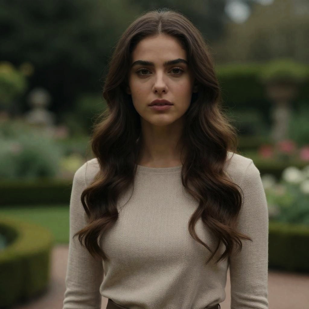A vintage sepia toned photograph effect featuring a woman with waist-length curly chestnut hair and medium skin tone in a simple yellow top, gazing with a wistful, dreamy expression and thick dark brows. Set in antique train carriage with velvet seats and polished wood reduced to clean shapes and gentle blur. Minimalist composition, flat colors with soft gradients, balanced negative space, subtle rim light; medium close-up, crisp edges, contemporary editorial feel. Palette leans toward cool blue-green with a warm yellow accent. No text, no logos.