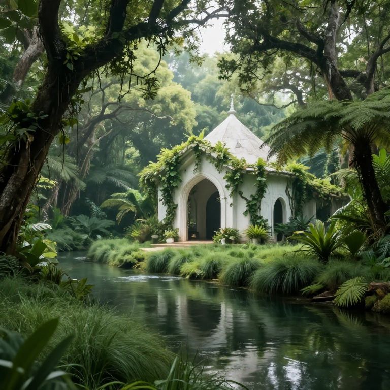 The image depicts a serene tropical oasis, bathed in a magical, ethereal light. A rustic al fresco structure, reminiscent of white elven architecture, stands majestically in the center, its arched entrance partially obscured by lush vines and foliage. The structure is nestled amidst a dense, verdant environment, with tall oak trees and ferns framing the scene. The ground is covered with a carpet of zoysia grass, adding to the lush, green ambiance. A tranquil river flows gently in front of the structure, its surface reflecting the surrounding foliage and the soft, diffused light filtering through the canopy. The overall composition is harmonious, with elements arranged in a balanced, symmetrical manner, creating a sense of tranquility and wonder. The image is a beautiful representation of a magical, cinematic world, where nature and architecture blend seamlessly, evoking a sense of enchantment and awe.