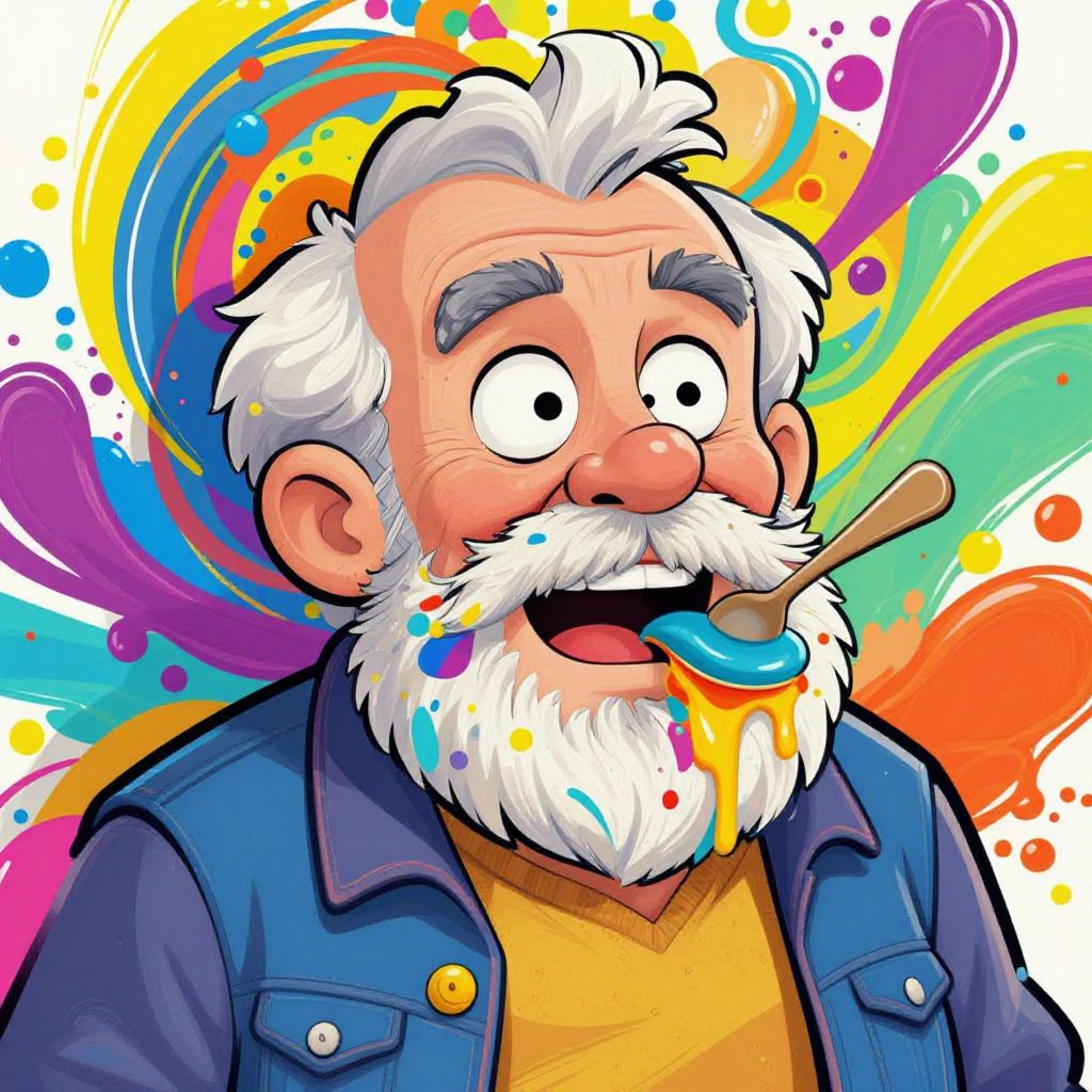 Old man that ate paint, exaggerated cartoon style, bright and messy colors dripping from beard and clothes, playful expression with twinkling eyes, background filled with swirling paint patterns, humorous yet detailed, bold outlines and dynamic color splash